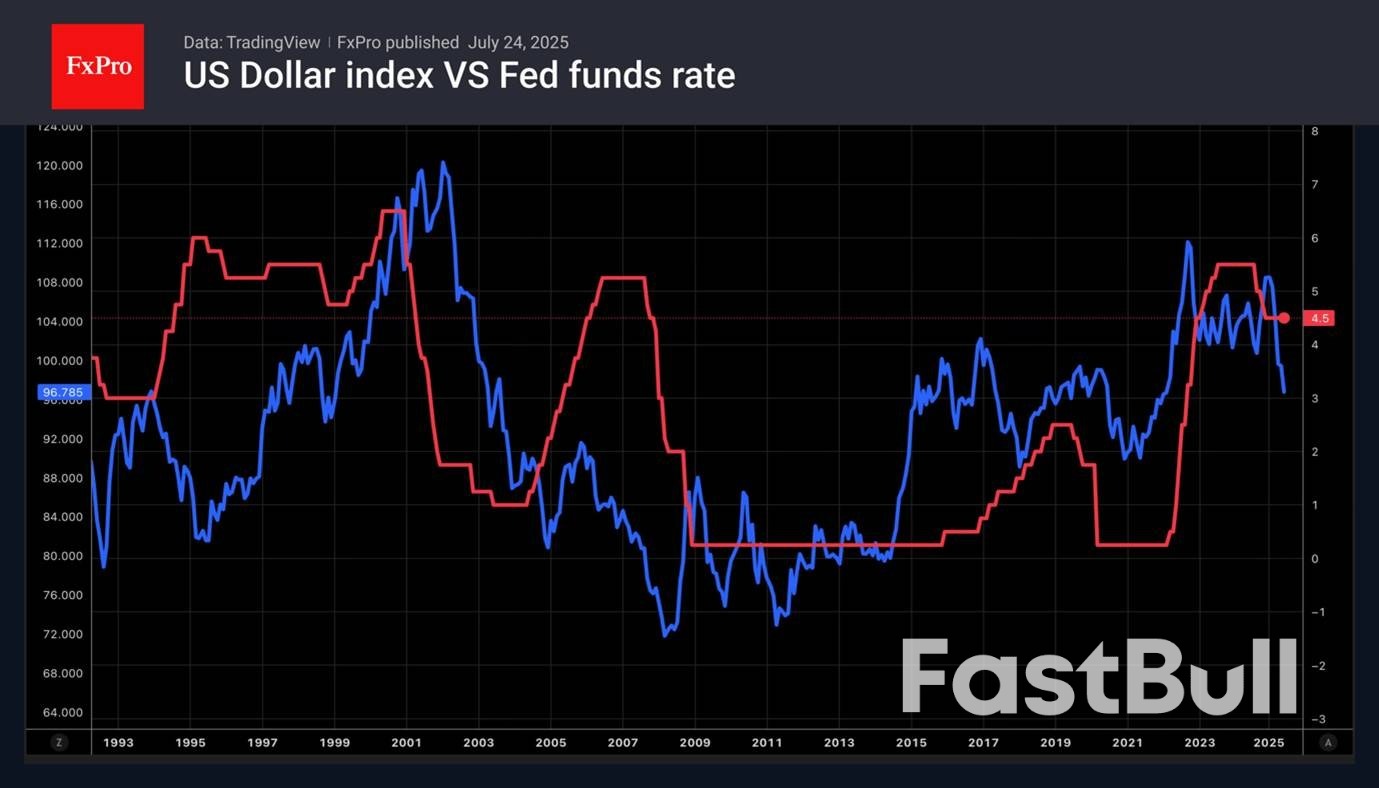 The reduced risk of a large-scale trade war between the US and the EU is increasing global risk appetite and putting pressure on the US dollar as a safe-haven asset. At the same time, the reduction in trade uncertainty is giving the Fed a free hand to ease monetary policy. A sharp cut in the federal funds rate may happen sooner than expected, contributing to the dollar’s decline.
