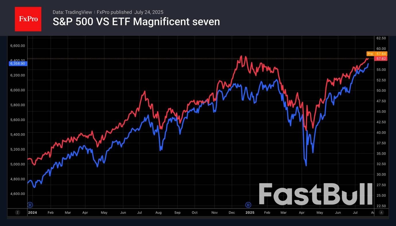 The US economy is not falling off a cliff since trade deals are reducing uncertainty. The Fed is moving towards easing monetary policy, and corporate earnings are positive. What else do stock indices need for a rally? The S&P 500 continues to break historical highs and eagerly awaits data from the so-called Magnificent Seven. Analysts expect those companies to report 14% profit growth compared to just 3% growth for the other 493 companies in the broad stock index.