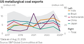 India's met coal imports from the US steadily increased after 2021, hitting a record 8.8 million mt in 2024, second only to China's 11 million mt. India is already the lead destination for US met coal this year with 6.7 million mt as of Aug. 21, ahead of Brazil's 4.8 million mt and the Netherlands' 3.7 million mt. China stood at 1.4 million mt amid trade tensions with the US.The US, whose coal industry is now aided by an accommodative president, was India's third-highest met coal source behind Australia and Russia in 2024. Russia's exports to the subcontinent have also risen since 2021.