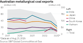 A slowdown in China's property sector lowered demand and cut met coal prices across product categories in fiscal 2025, and "India's demand has also been tempered by the early onset of the monsoon season along with higher levels of domestic production," Yancoal said Aug. 19 in its half-year report.However, "the Indian growth opportunity is real," Mark Salem, Yancoal's executive general manager of marketing, said on an analyst call Aug. 20.