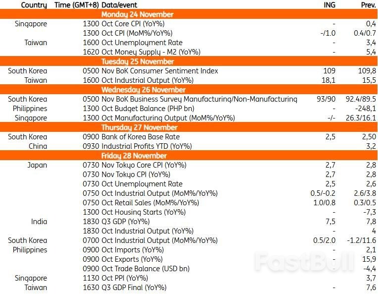 Tokyo's consumer price index inflation is expected to rise 2.7% YoY in November, supported by solid wage gains. The weaker JPY probably added upward pressure. Industrial production will likely remain positive following Japan's trade agreement with the US. Despite a contraction in the third quarter, recent data suggest an economic recovery, supporting the Bank of Japan's continued policy normalisation. Market expectations for a December rate hike have fallen sharply over the week. We believe that recent BoJ comments indicate at least three board members support a more hawkish stance. However, it remains unclear if others will agree. We continue to forecast a rate hike in December, though the likelihood of a delay to January is rising.