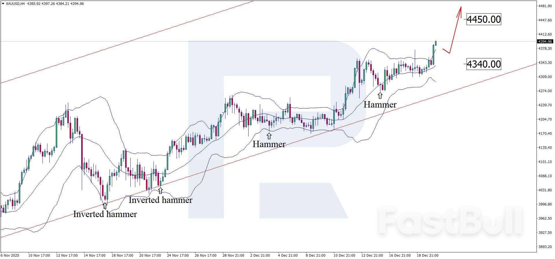 The XAUUSD forecast for December 22, 2025 is fully bullish for gold. Technical analysis suggests further price growth toward the 4,450 USD level.