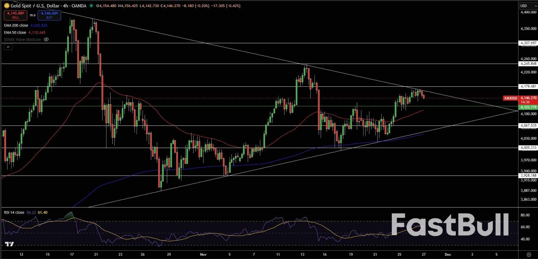 Gold – ChartGold is consolidating near $4,146, trading inside a tightening symmetrical triangle that has been developing through November. The metal continues to respect its rising trendline from the November 13 low, while the upper boundary near $4,180 remains firm resistance. Price is holding above the 50-EMA and 200-EMA, signaling underlying support even as upside momentum slows.
