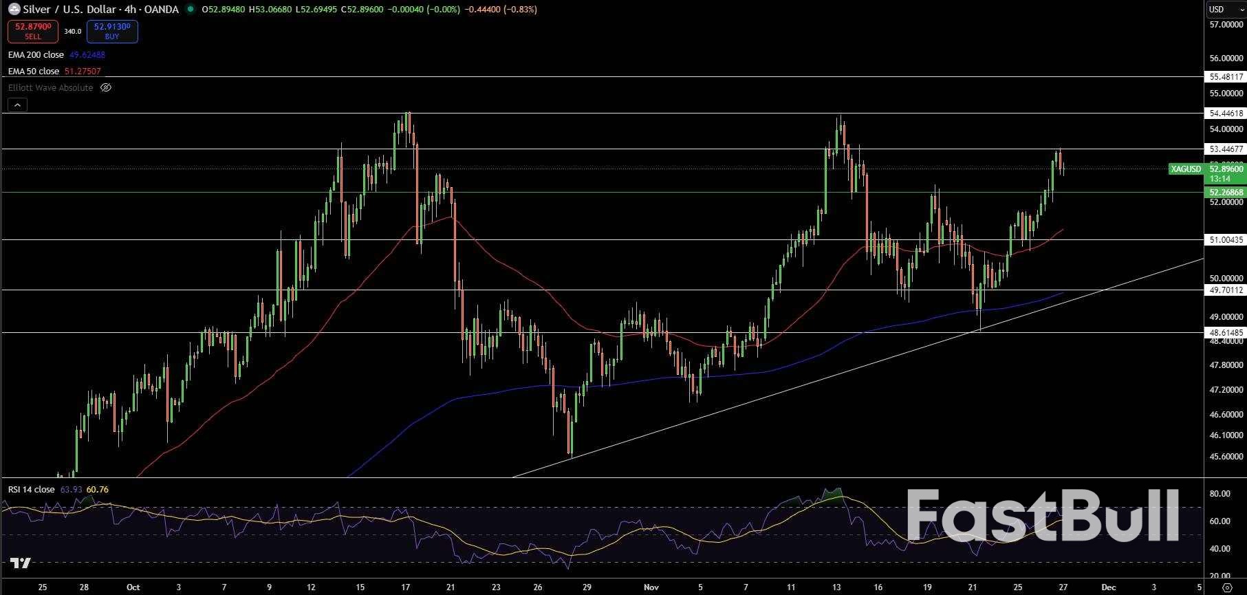 Silver – ChartSilver is consolidating near $52.89, holding firmly above the key support at $52.26 after a strong recovery from the $49.70 region. Price continues to trade above the 50-EMA and 200-EMA, signaling a stable bullish bias while respecting the broader ascending trendline from late October. The RSI sits around 63, showing improving momentum without overextended conditions.