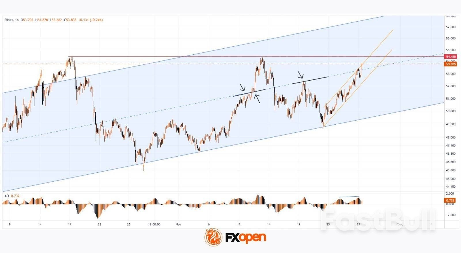 Examining the XAG/USD chart, we can identify key swing points that allow us to outline an ascending channel. This week's strong advance has pushed silver into the upper half of that channel.