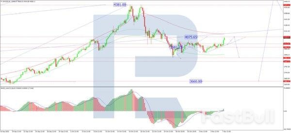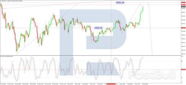 On the H1 chart, the market is also consolidating around 3,988 USD. An upward breakout is likely to propel prices towards 4,075 USD, after which a decline to at least 4,020 USD is expected. The Stochastic oscillator aligns with this view, as its signal line is positioned above 80 and appears poised to reverse downward towards 20, indicating potential for a near-term pullback.