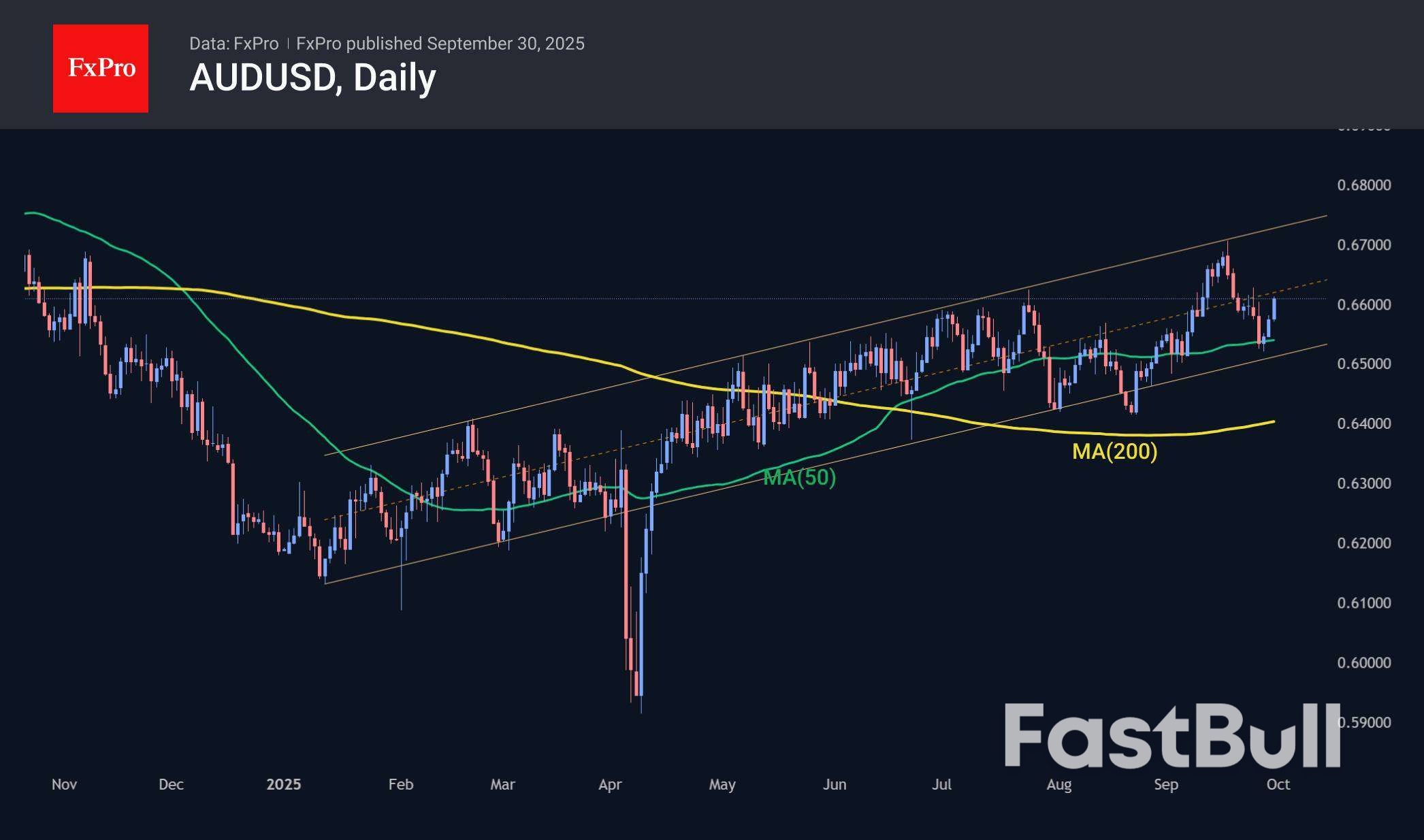 The Aussie touched the upper limit of this channel on 17 September, briefly exceeding 0.6700, but the looming US government shutdown halted the strengthening of the USD on the Fed’s cautious comments. This exceptionally short-term and speculative story (a compromise was always found sooner or later) nevertheless undermines long-term confidence in the dollar, preventing it from reversing the downward trend that began at the start of the year.