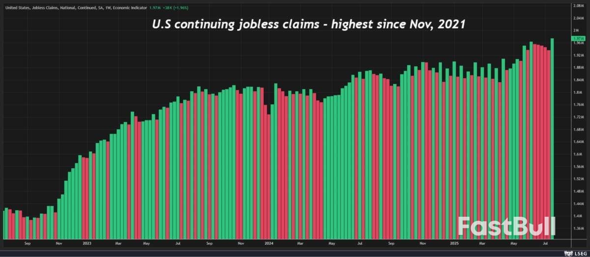 One high-frequency number that has gone under the radar, but which merits more attention is continuing jobless claims, which measures the number of workers continuing to file for unemployment benefits after losing their jobs. Rising continued claims suggest people actively looking for a job are struggling to get one, a sign that the labor market could be softening.