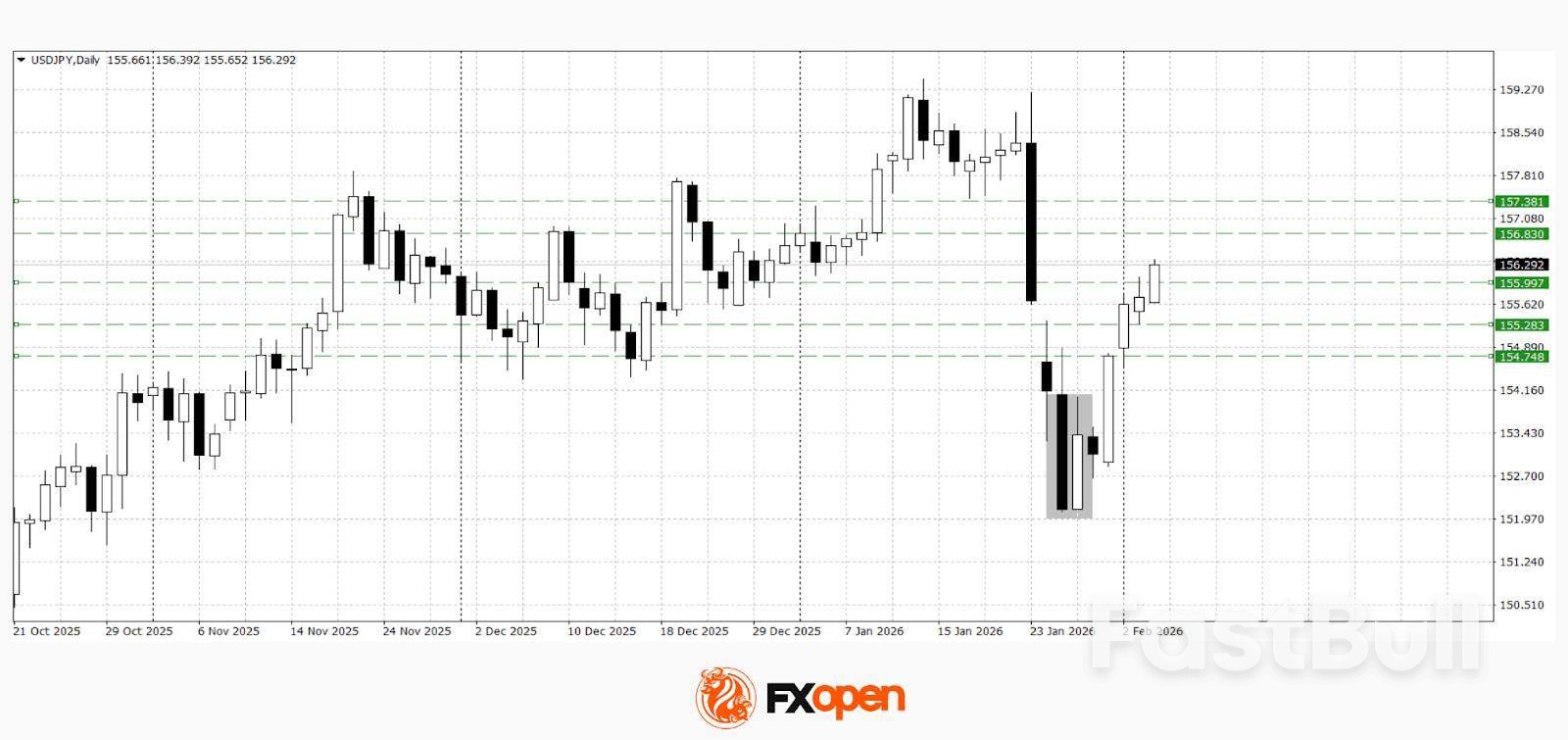 L'USD/JPY ha corretto al rialzo dopo il brusco calo della scorsa settimana, riflettendo un rimbalzo tecnico dai minimi locali. Sul timeframe giornaliero, si è formato un pattern harami rialzista, il cui follow-through supporta un rialzo verso il livello 156,00. Se l'attuale slancio rialzista rimane intatto, è possibile un test della resistenza chiave nell'area 156,60-156,80. Tuttavia, notizie sfavorevoli per il dollaro potrebbero vedere la coppia ritirarsi verso 154,80-155,30.