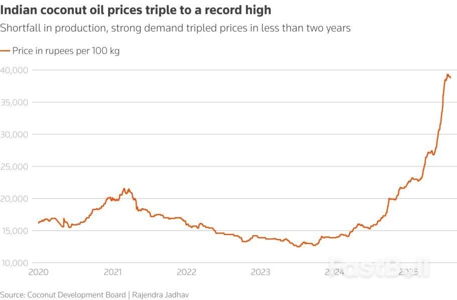 "Passerò all'olio di girasole raffinato, più economico, per la cucina di tutti i giorni e risparmierò l'olio di cocco per i piatti in cui il suo sapore è assolutamente insostituibile", ha affermato Leelamma Cherian, che vive nello stato meridionale del Kerala in India. L'impennata dei prezzi iniziata nella seconda metà del 2024 è stata accelerata dalle interruzioni della produzione nei principali paesi produttori, dall'India al Sud-est asiatico, causate da stagioni di scarse precipitazioni, caldo prolungato e maggiori devastazioni da parte di parassiti e malattie.