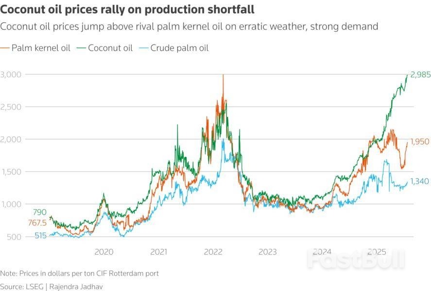 I prezzi dell'olio di cocco stanno aumentando vertiginosamente in Asia, dove l'India, il principale consumatore, è in testa alla classifica, triplicando il prezzo in due anni, poiché la carenza di scorte e la crescente domanda di acqua ricca di nutrienti contenuta al suo interno trasformano questo alimento base in un prodotto di alta qualità. L'olio commestibile sta sfuggendo alla portata dei consumatori attenti al prezzo e coloro che sono abituati al suo sapore caratteristico, profondamente radicato nella cucina regionale, devono cercare con più impegno alternative.