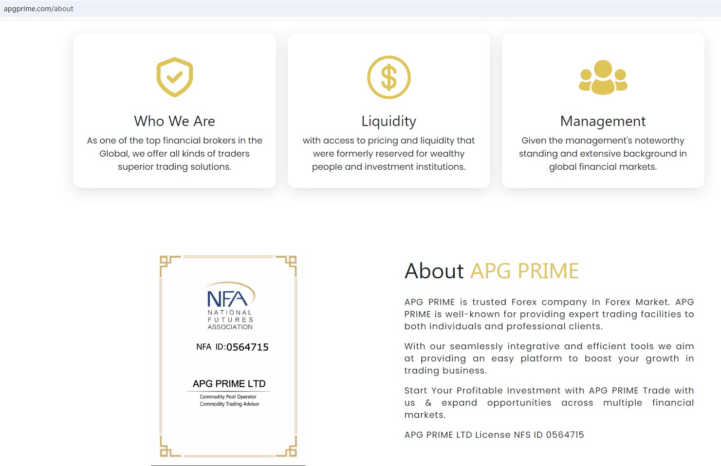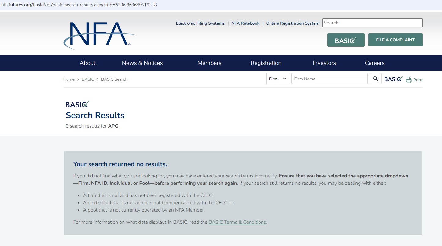 The company claims to be regulated by the National Futures Association (NFA). However, there are no records suggesting that APG PRIME is registered with or supervised by the NFA. This means APG PRIME is misrepresenting its legal status, which is a significant fraudulent practice.