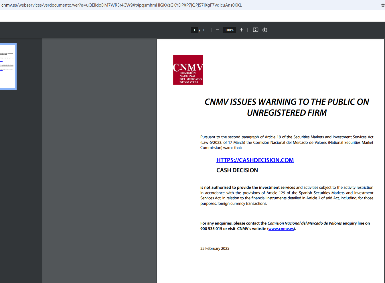 2025年2月25日、国家証券市場委員会(CNMV)は、Cash Decision社が適切な許可を得ずに金融サービスや金融商品を提供している可能性があるとして、同社に対して警告を発しました。https://www.cnmv.es/webservices/verdocumento/ver?e=uQEiidoDM7WR5r4CW9Xt4pqsmhmHlGKVzGKYDPXP7jQPj57IXgF7VdIcuAns0KKL