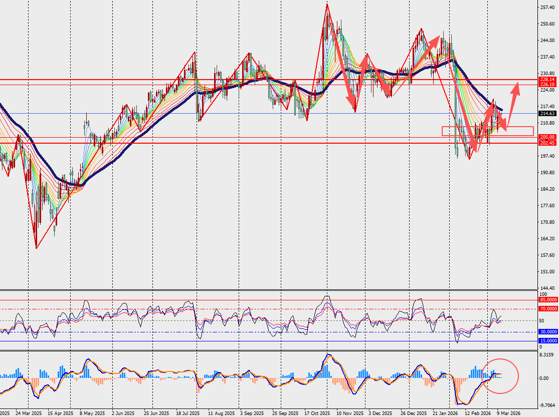 第一阻力位:224.00 第一支撑位:203.00