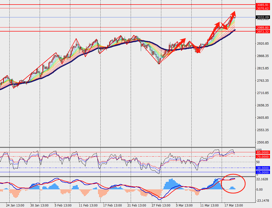 第一阻力位:3050.00 第一支撑位:3014.00
