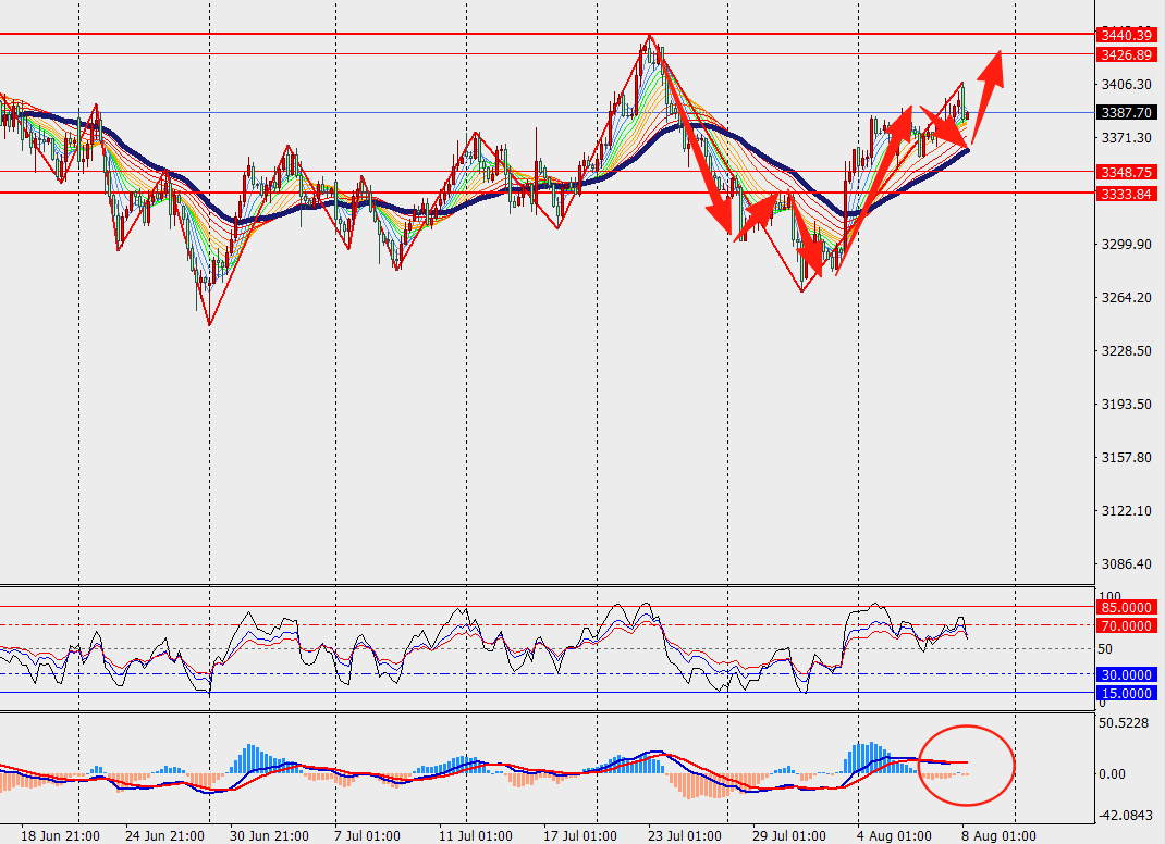第二阻力位:3423.00 第二支撑位:3352.00