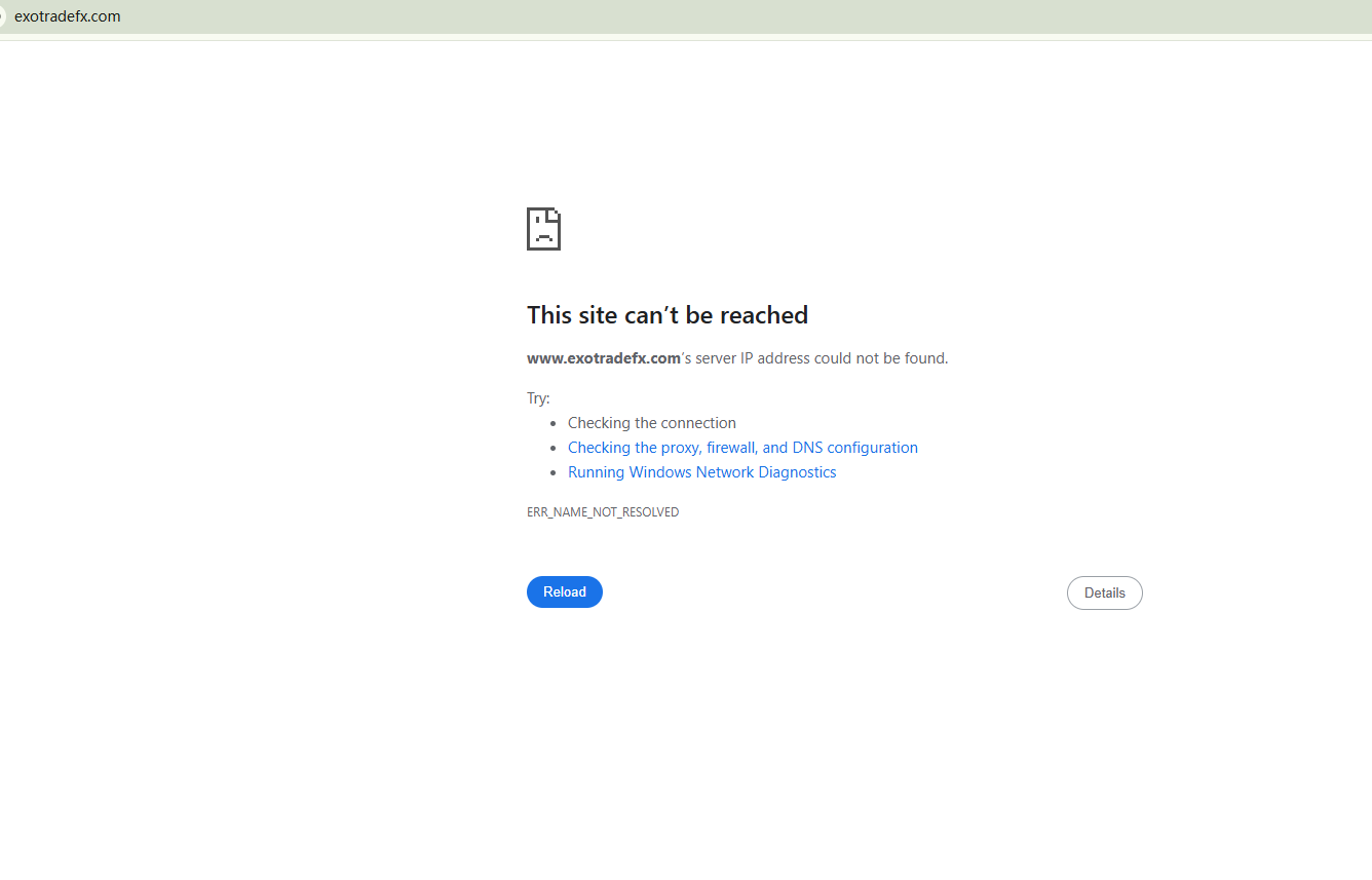 BrokersViewは、ドメイン「https://www.exotradefx.com/」が現在アクセス不能であることを確認しました。これは、ブローカーのウェブサイトが停止されることは、通常、規制上の問題や運営上の問題を示唆する重大な警告サインと広く認識されています。