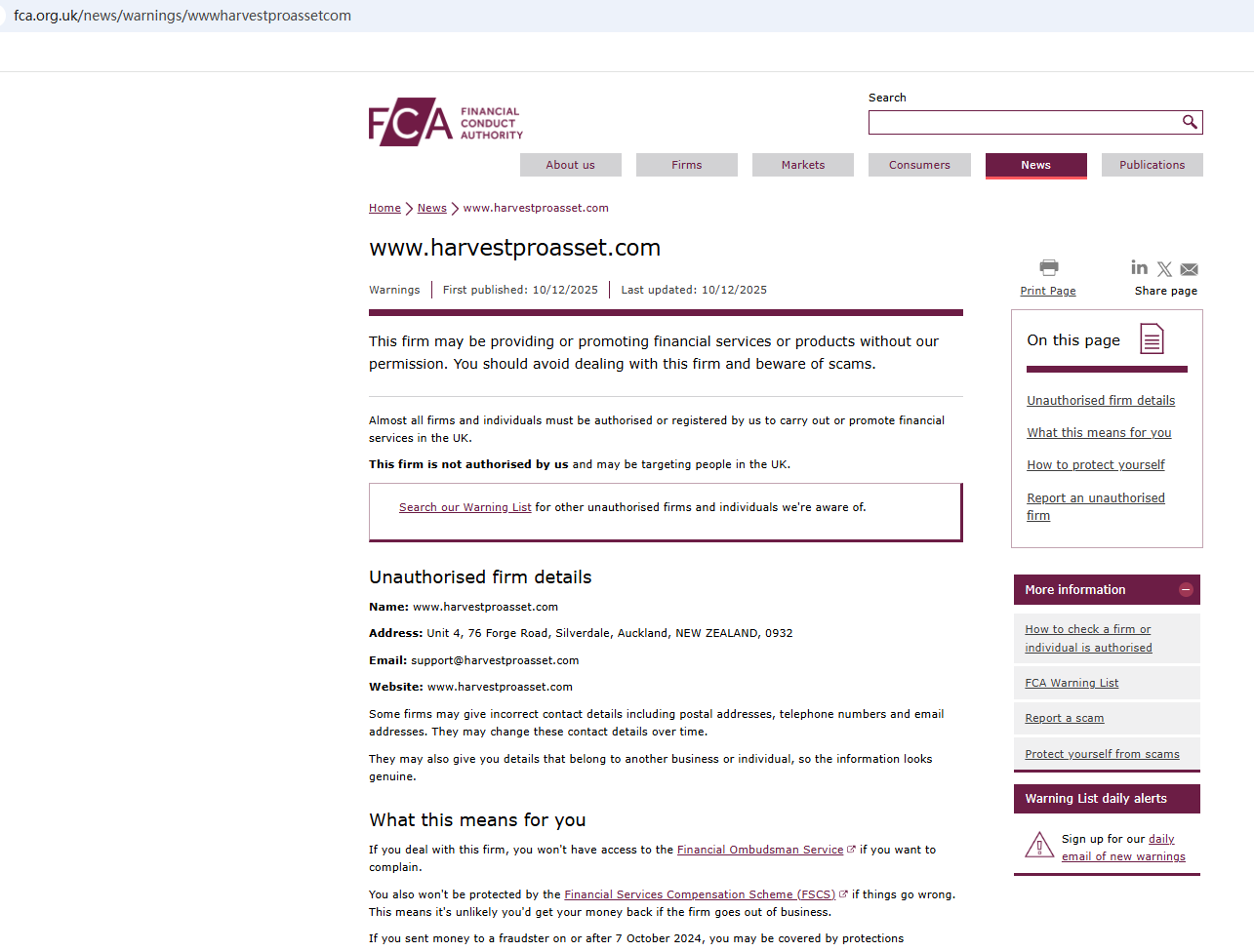 2025年12月9日、金融行動監視機構(FCA)は、Harvest Pro Assetが必要な認可を受けずに金融サービスや金融商品を提供している可能性があるとして、同社に関して警告を発しました。https://www.fca.org.uk/news/warnings/wwwharvestproassetcom