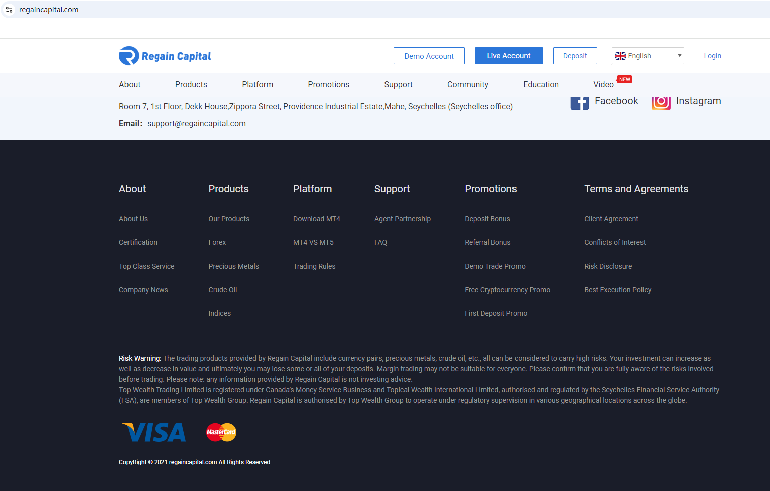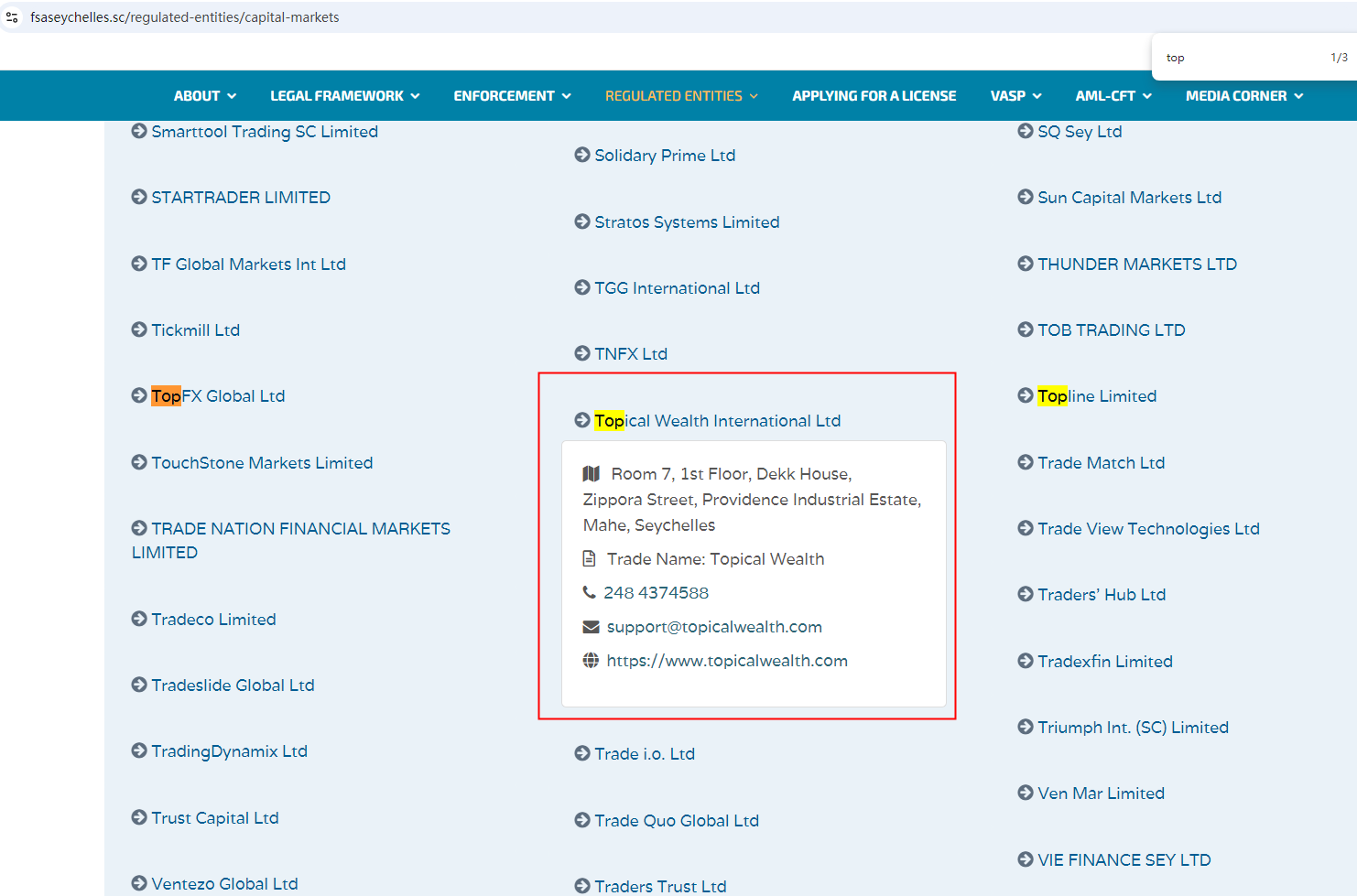 同社は、セイシェル金融サービス機構(FSAセイシェル)の規制下にあるTop Wealth Groupのメンバーであると主張しています。調査の結果、Top Wealth GroupはFSAに登録されていることがわかりました。しかし、登録情報を注意深く確認したところ、Regain CapitalのウェブサイトはFSAに登録されているウェブサイトと一致していないことがわかりました。これは、規制に準拠している会社のウェブサイトのなりすましです。投資家は、これを識別するために注意することをお勧めします。