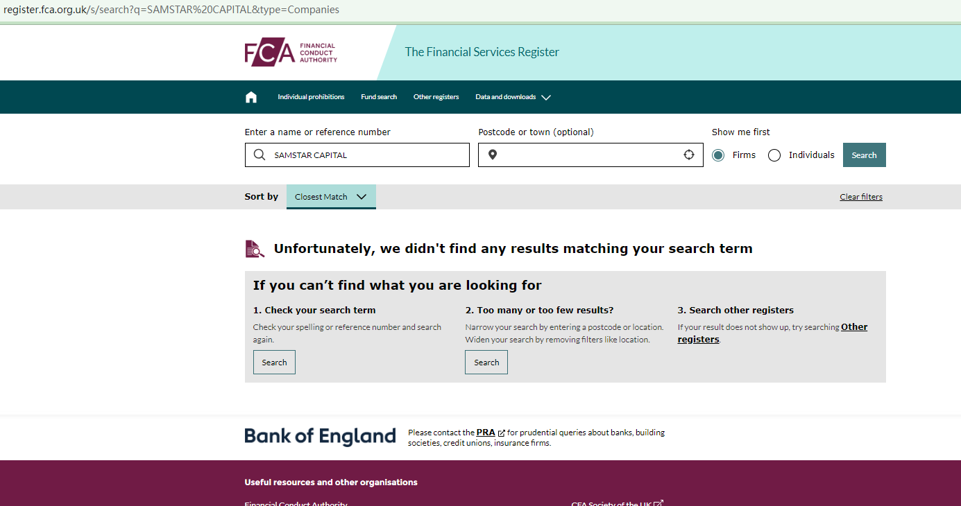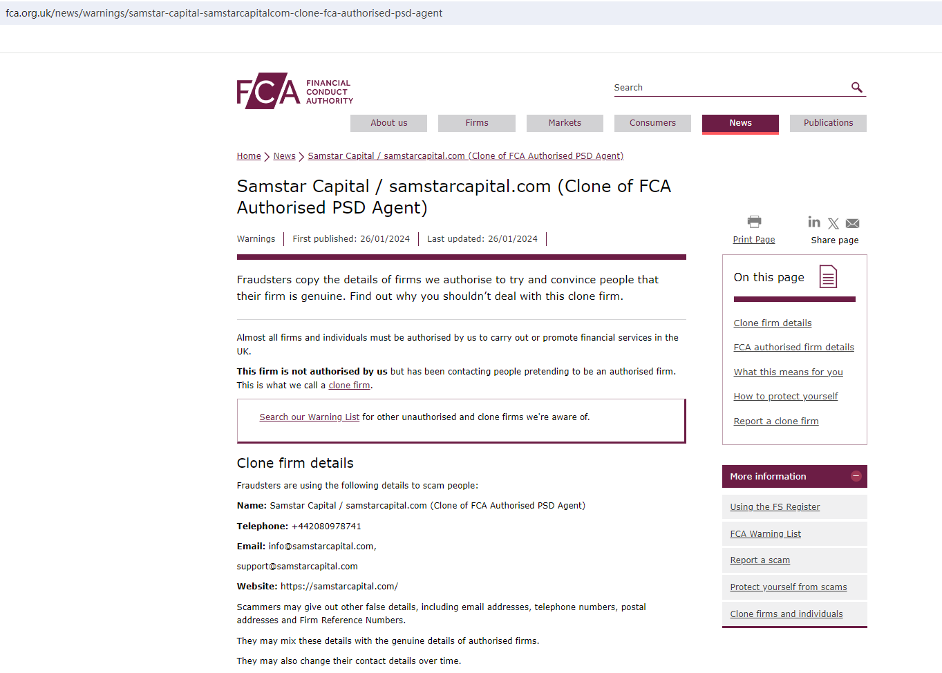2024年1月26日、金融行為当局(FCA)はサムスター・キャピタルに対する警告を発表し、このクローン企業の公衆に警告した。https://www.fca.org.uk/news/warnings/samstar-capital-samstarcapitalcom-clone-fca-authorised-psd-agent