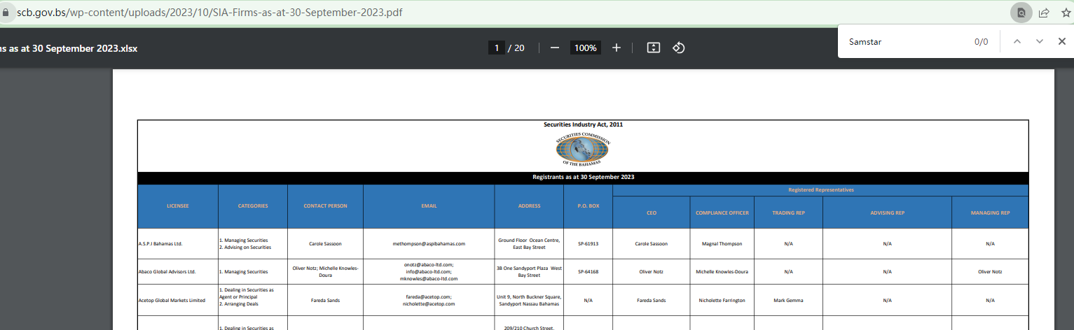 サムスター・キャピタルは、規制されたブローカーであると偽り主張しています。金融行為当局(FCA)、キプロス証券取引委員会(CySEC)、バハマ証券委員会(SCB)、金融セクター行為当局(FSCA)によって規制されているという主張は、上記の規制当局の登録でこのブローカーを検索したため、一致した記録を返さなかったため、根拠がありません。