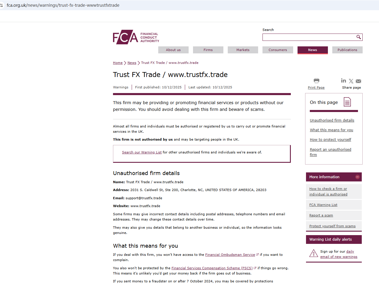 2025年12月9日、金融行動監視機構(FCA)はTrust FX Tradeに関して、この会社が必要な認可を受けずに金融サービスや金融商品を提供している可能性があるとして警告を発しました。https://www.fca.org.uk/news/warnings/trust-fx-trade-wwwtrustfxtrade