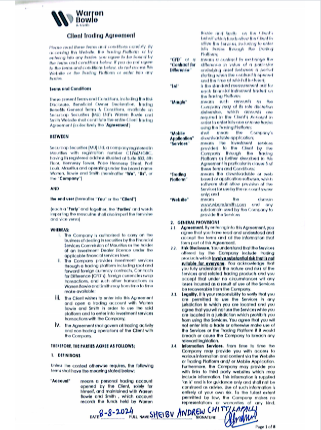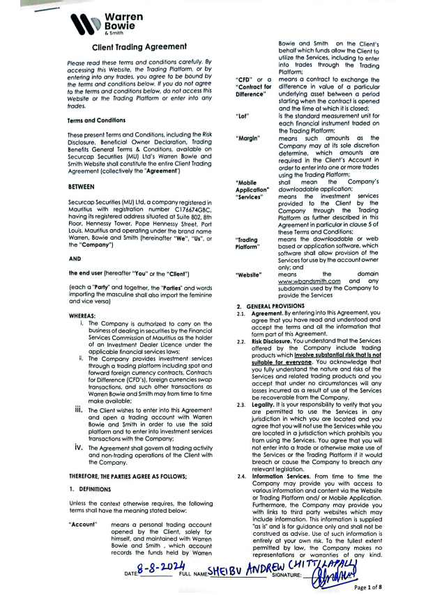 Warren Bowie and Smith is number one fraud company where they cheat the client and grab money for their company benefit. Sueliman, Siraj and Parvez one of the third class staffs who spoke about the claim that they will pay back 37940 dollars and there is official email sent to me and they kept me running behind them for more than 4 months and not paid anything in return. All of then are working like a gang to loot the clients. Guys be careful before you invest in any company, check their license and regulatory rights. Even the Owner is a piece of shit who is not coming in the front like a lady hiding behind the bar.