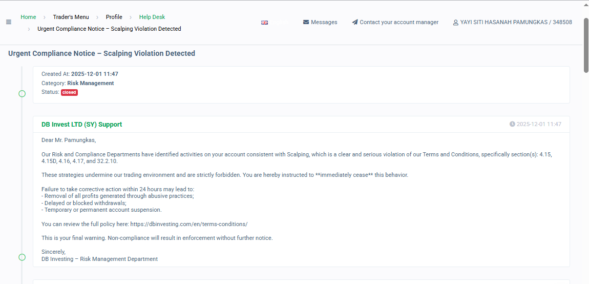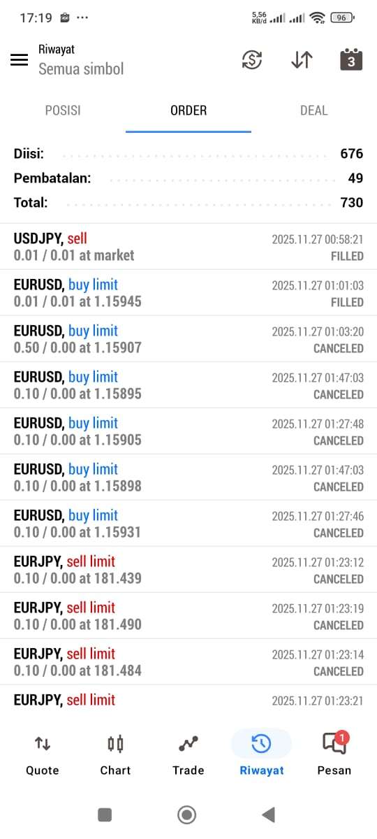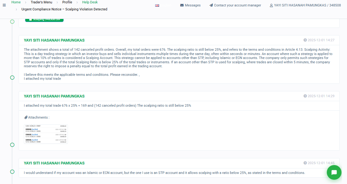 The attachment shows a total of 142 canceled profit orders. Overall, my total orders were 676. The scalping ratio is still below 25%, and refers to the terms and conditions in Article 4.13. Scalping Activity: This is a day trading strategy in which an investor buys and sells individual instruments multiple times during the same day, often within seconds or minutes. An account where such a strategy is applied to more than 10% of trades is considered a Scalping Account. This strategy cannot be applied to accounts other than STP, including Islamic or ECN accounts. The company only permits such strategies for STP accounts and only if the total Scalping Ratio is below 25% of the total trades or instruments. If an account other than STP is used for scalping, where trades are closed within 5 minutes, the company reserves the right to impose a penalty equal to the total profit earned in the trading account.