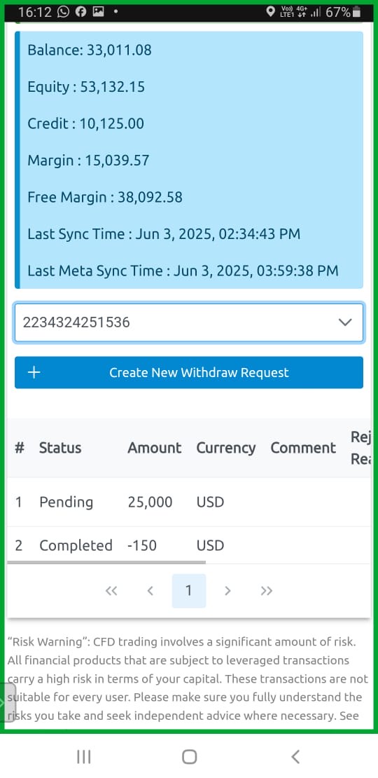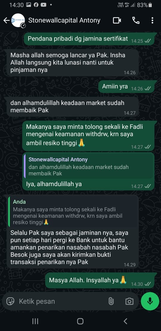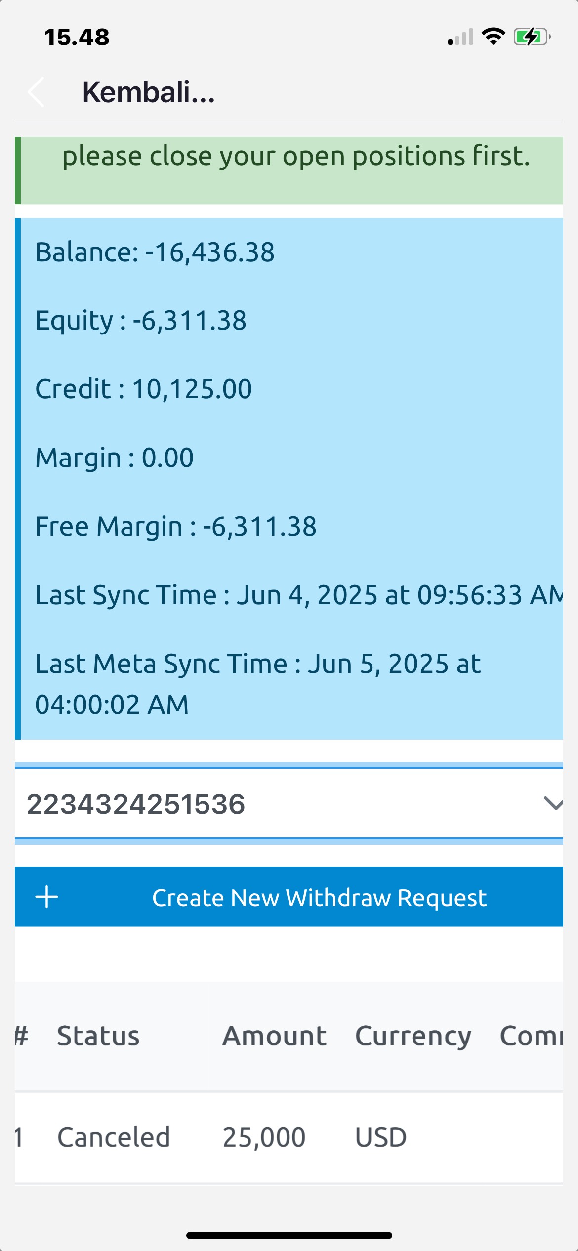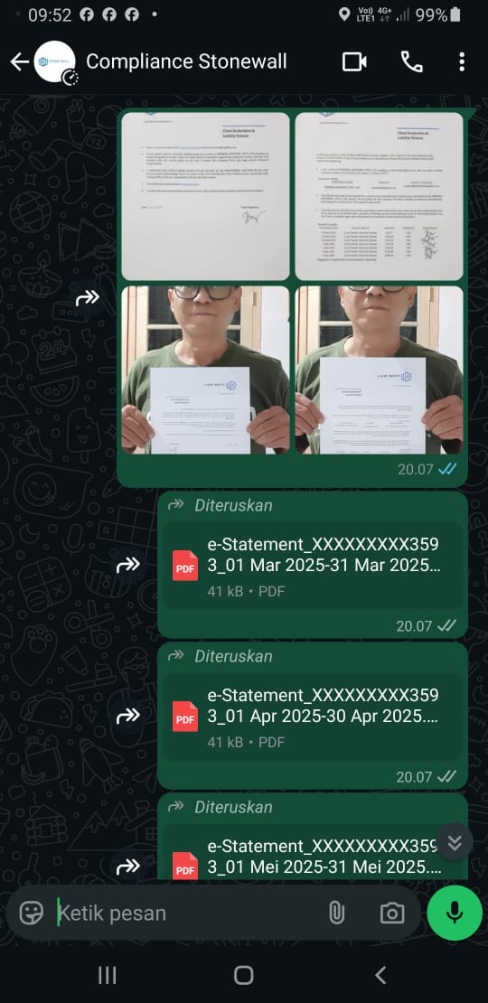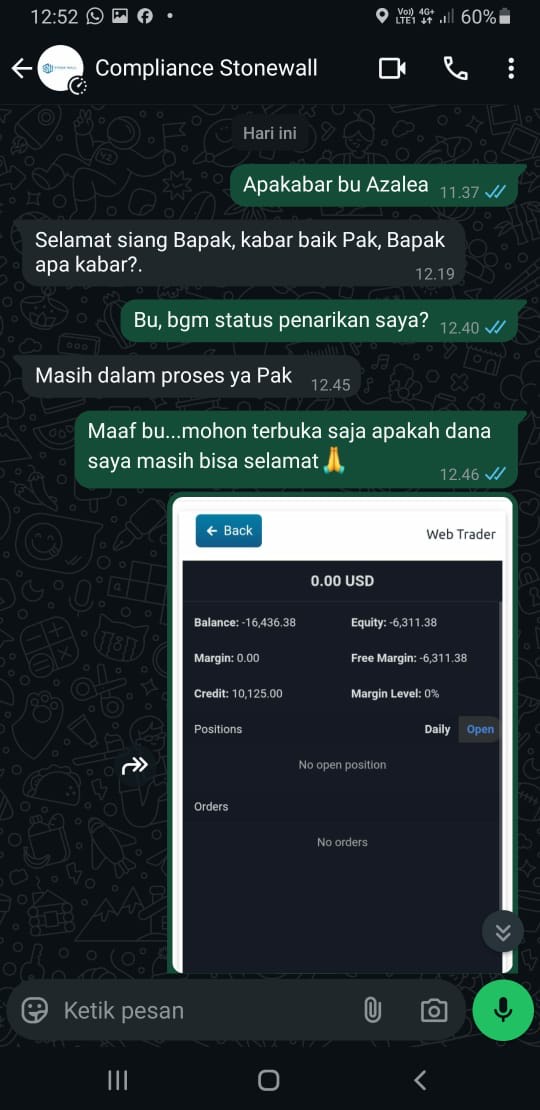 And for the withdrawal of funds, I had to complete the documents and sign the client declaration I sent the document back to someone named Azalea at 20.07 WIB. Until 00.30 WIB on June 4, 2025, my account position was still fine. At 8.00 WIB I checked the account position and it turned out to have traded out with a minus position. At 11.37 WIB I got a WA reply from Azalea saying that the withdrawal of funds was still in process. But until this report was made, no one had contacted me again