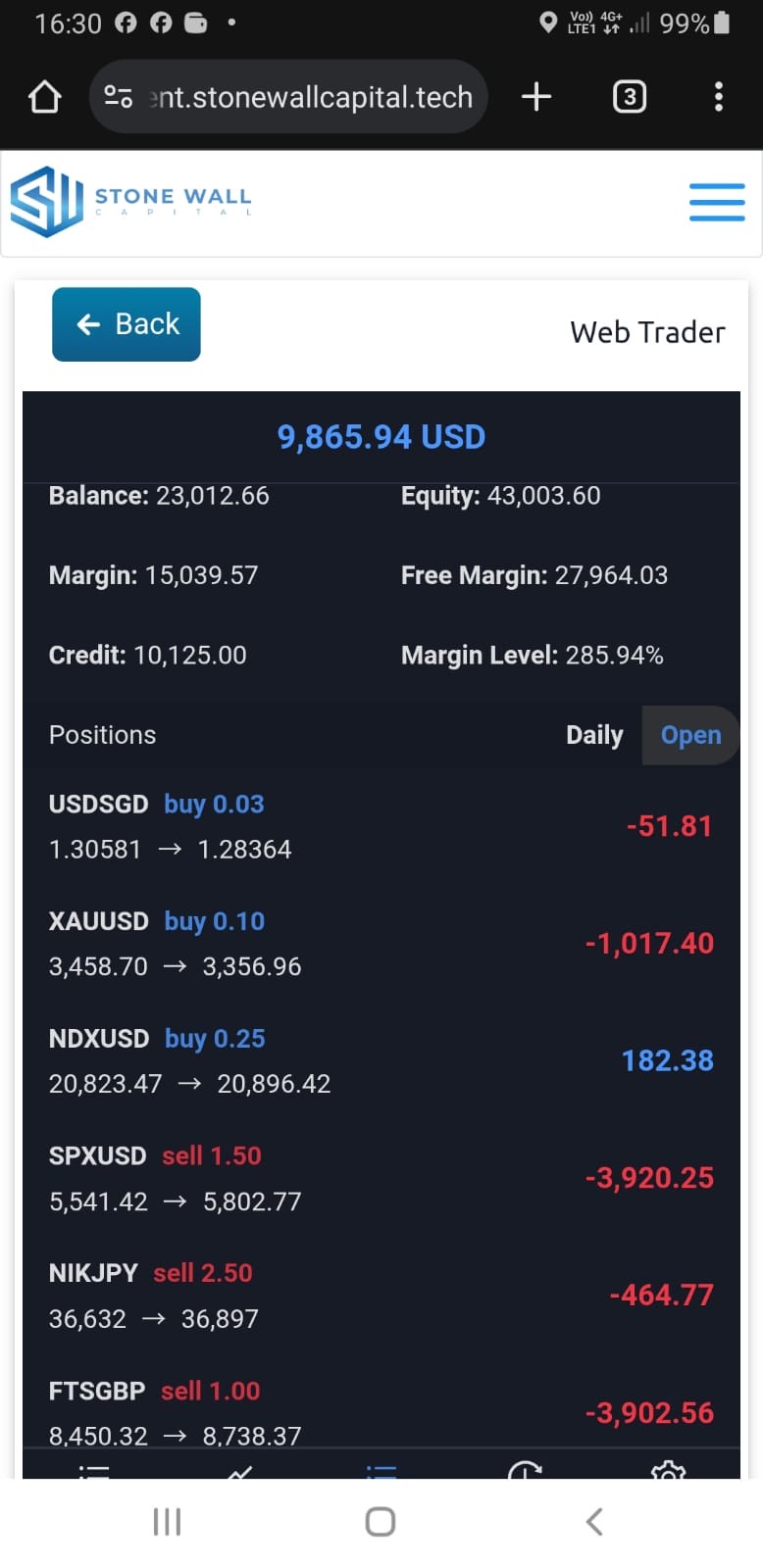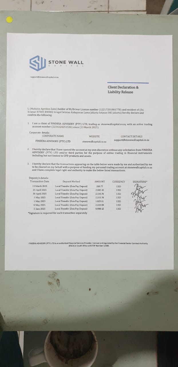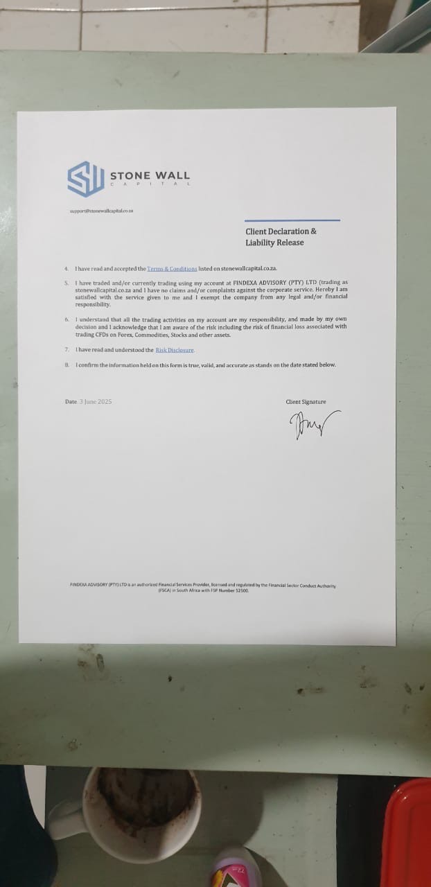 I have opened a trading account on the Stonewall Capital/FINDEXA ADVISORY (PTY) platform and have been actively trading since March 13, 2025 with account number 2234324251536. With specialist traders I actively trade. And with their encouragement I also added capital from time to time until the total deposit was $ 10,800 and made a profit of around $ 15,000. To prove that my funds could be withdrawn, then with specialist traders I made a withdrawal of $ 150 and successfully entered my bank account 2 days later.