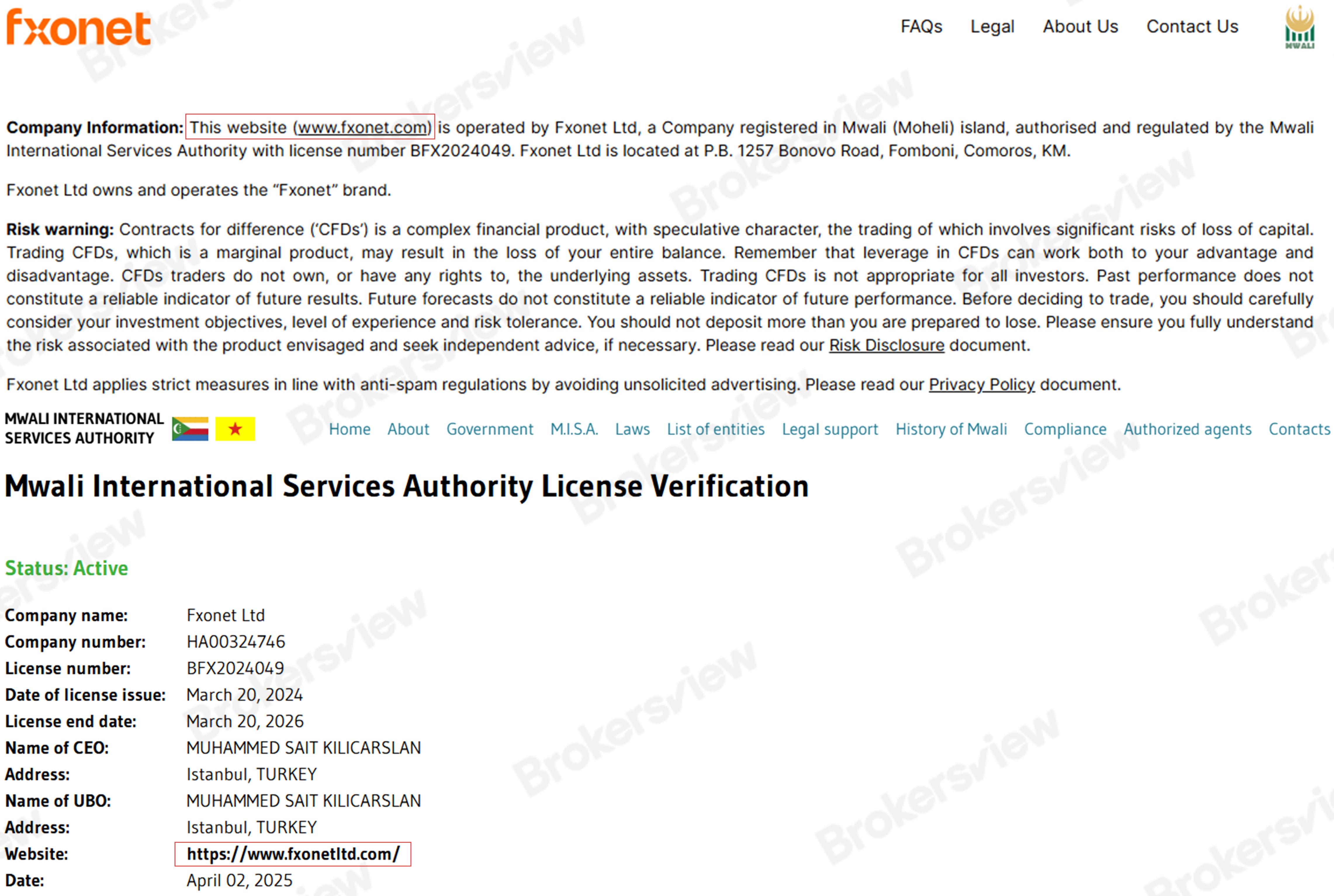 しかしながら、検証の結果、FXONETのドメイン名はMISAレジストリの承認済みドメイン名と一致していないことが判明しました。そのため、FXONETは認可を受けた企業の情報を盗用し、正当な企業を装っている可能性があります。また、MISAは認定された規制機関ではないことにご注意ください。