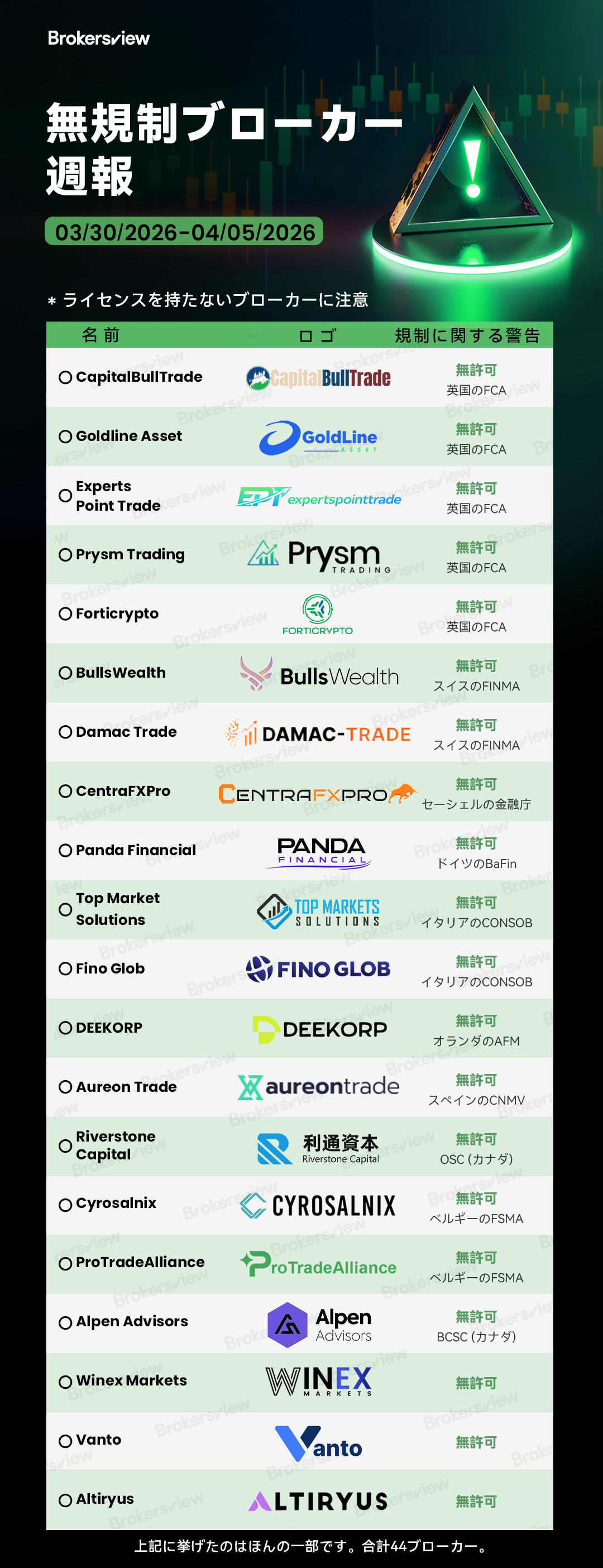 またしても、不正ブローカーの波が闇から暴かれました。3月30日から4月5日の間に、Brokersviewは、適切な認可を受けずに運営している、あるいは規制対象企業の偽装版を使用している無規制ブローカー44社を特定し、摘発しました。これらのプラットフォームは、FCA(英国)、BaFin(ドイツ)、CONSOB(イタリア)、FINMA(スイス)をはじめとする主要な規制当局によって警告を受けています。