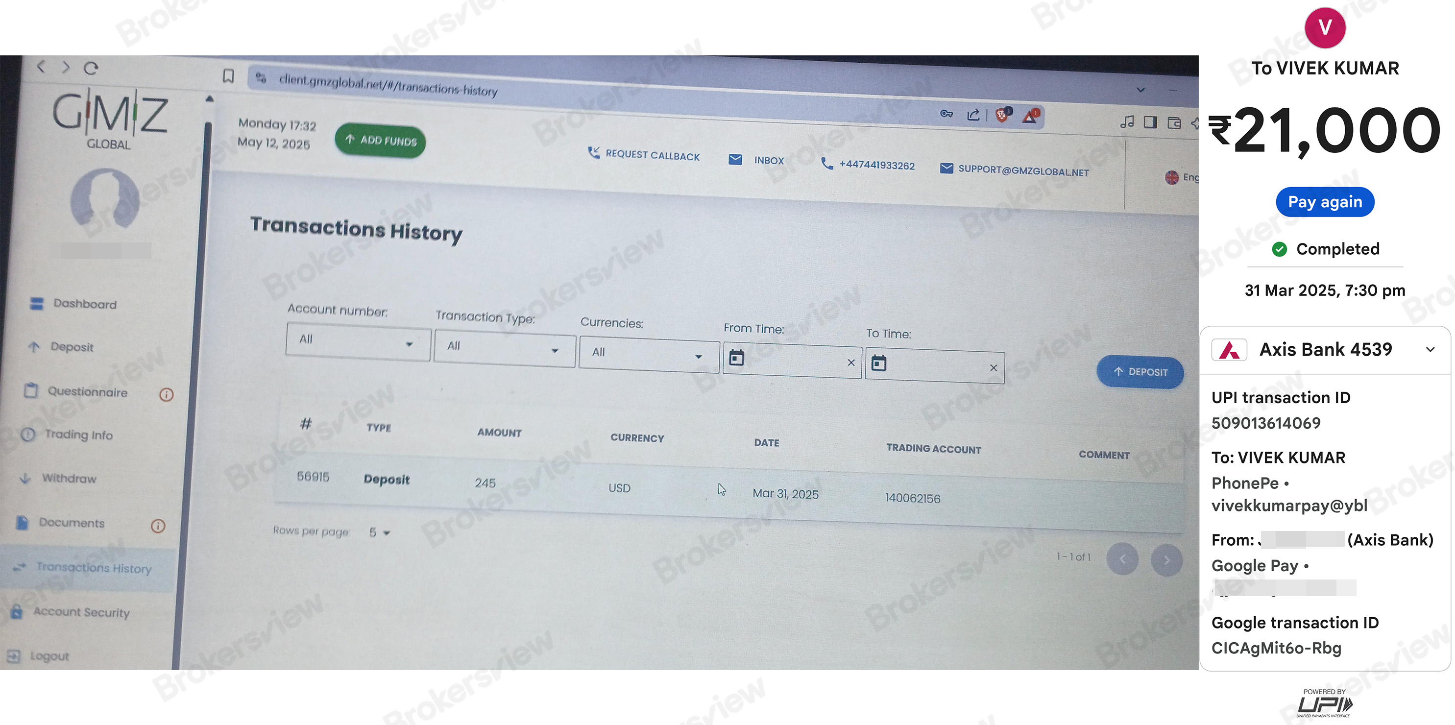 顧客がGMZ Globalプラットフォームに21,000ルピーを入金