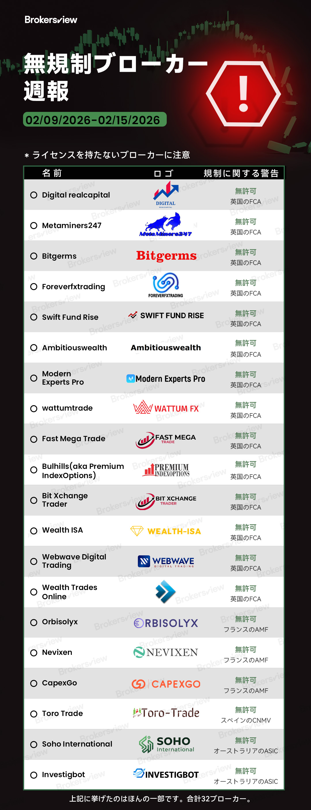 BrokersViewが発表した新たな調査報告書によると、2026年2月9日から2月15日の週に、無免許ブローカー32社が特定されました。調査結果によると、リストに掲載された事業体はいずれも公認金融規制当局からの認可を受けておらず、複数の管轄区域で金融サービス法に違反している可能性のある無免許事業者として分類されています。
