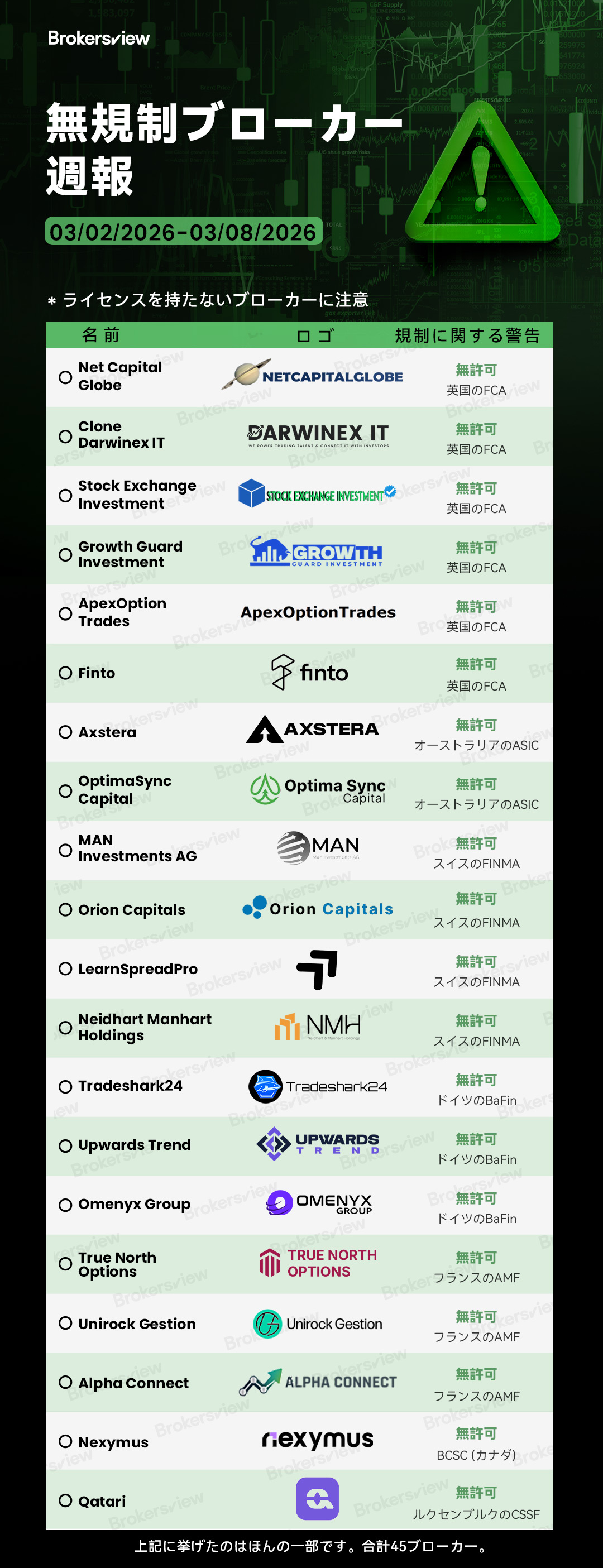 BrokersViewが発表した新たな調査報告書によると、2026年3月2日から3月8日までの1週間に、オンライン取引スキームを欺く無免許ブローカー45社が特定された。