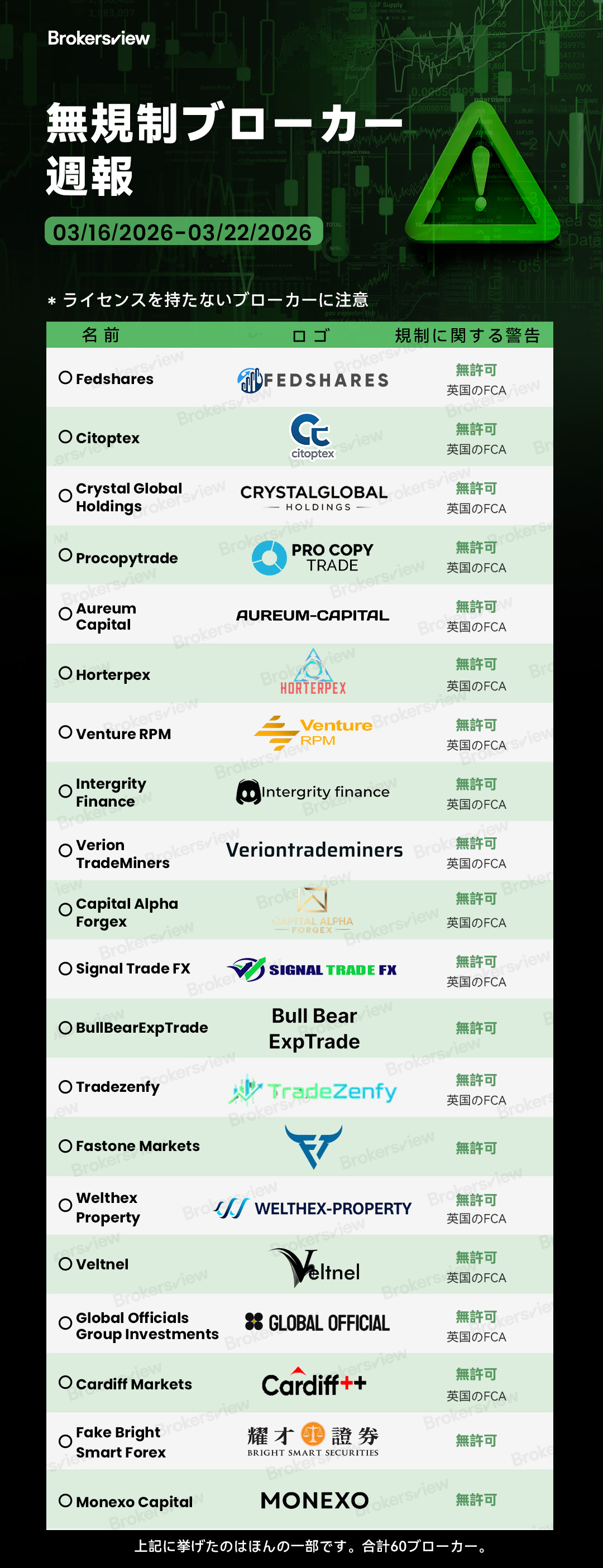 2026年3月16日から22日の週に、Brokersviewは、規制当局の認可なしに営業している、または英国金融行動監視機構(FCA)から公式警告を受けているとして、60の事業体のリストを作成しました。