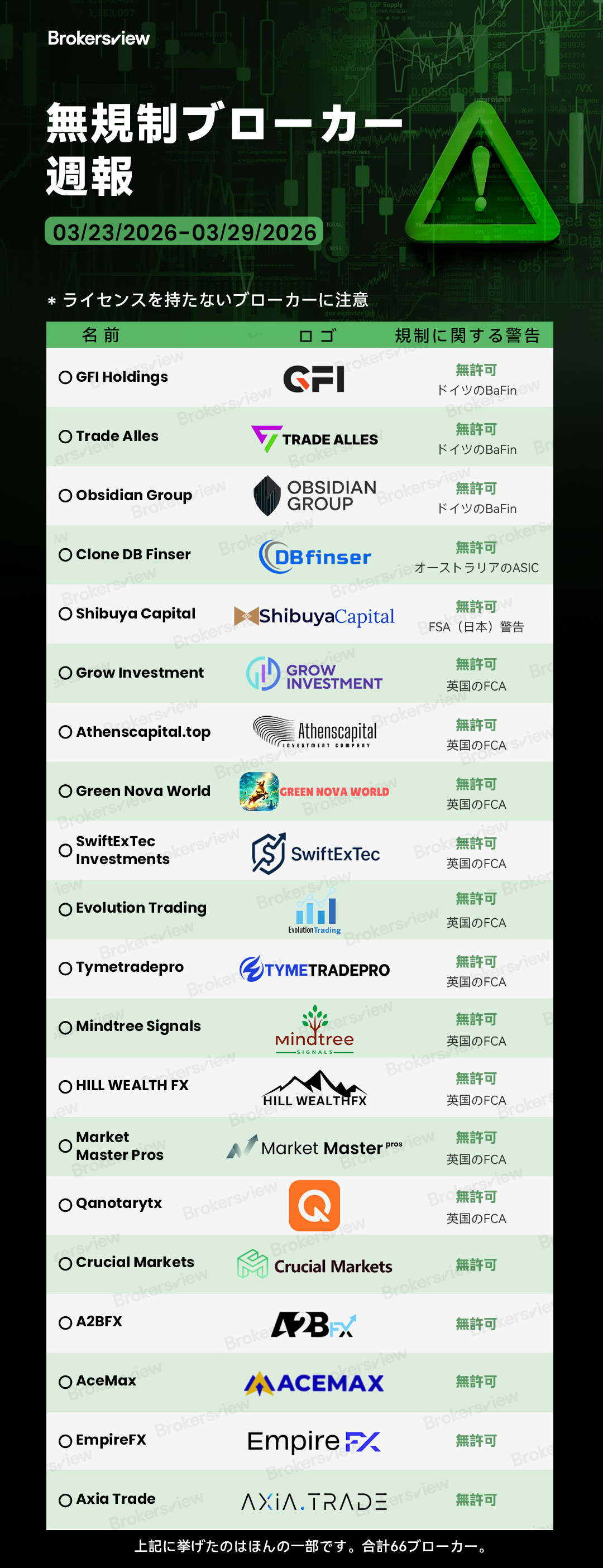 BrokersViewが2026年3月23日~29日の間に報告した無許可ブローカー: