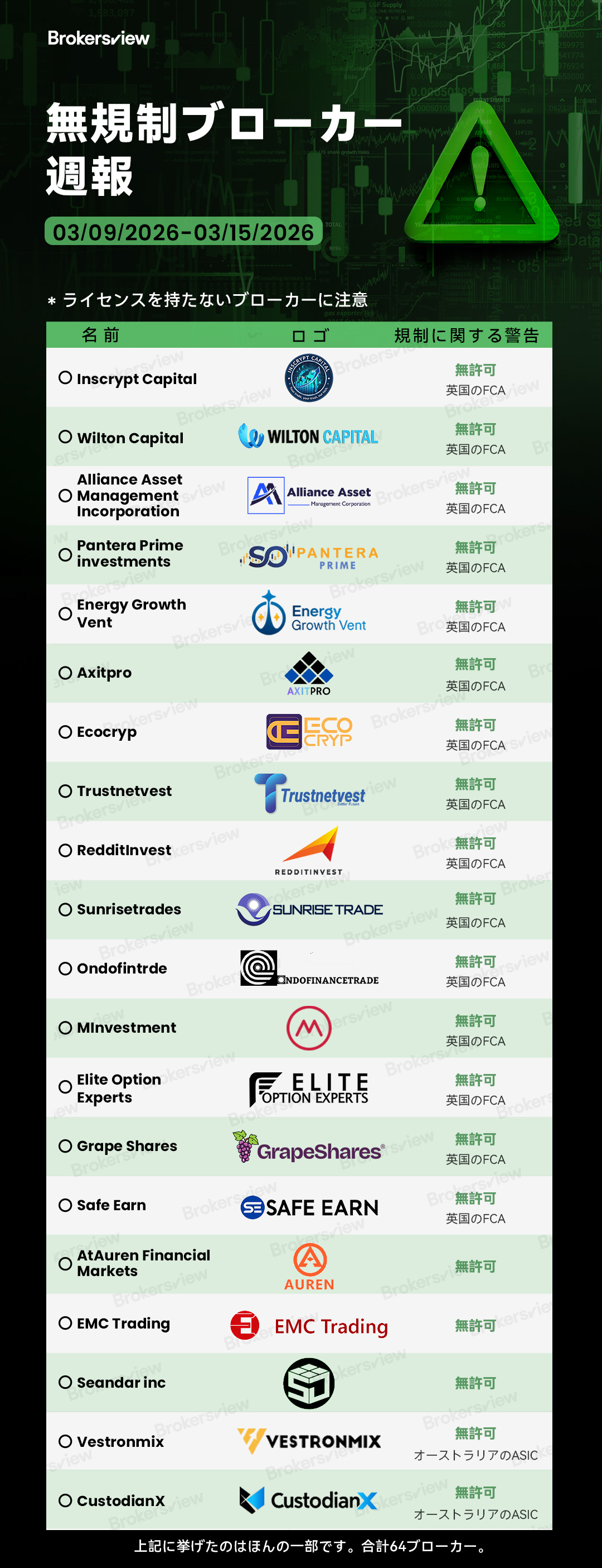 BrokersViewが2026年3月9日~15日の間に報告した無許可ブローカー: