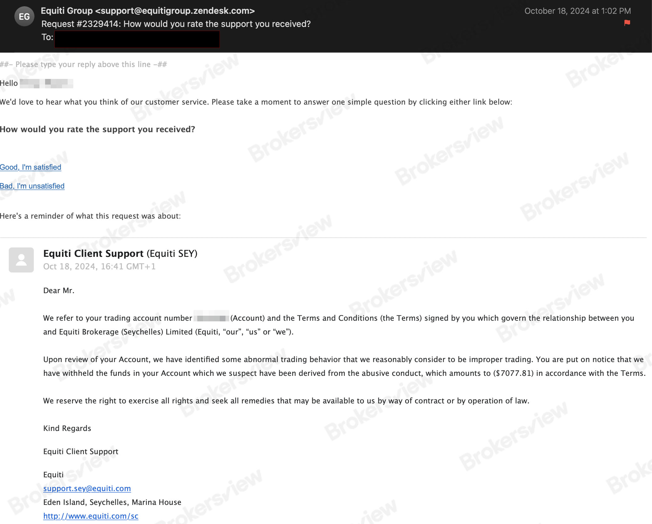 この事件は、エクイティ・セイシェルズが審査中に異常な行為が発見され、不適切な取引とみなされたとして、顧客の口座残高から7,077.81ドルを差し押さえたことから始まった。