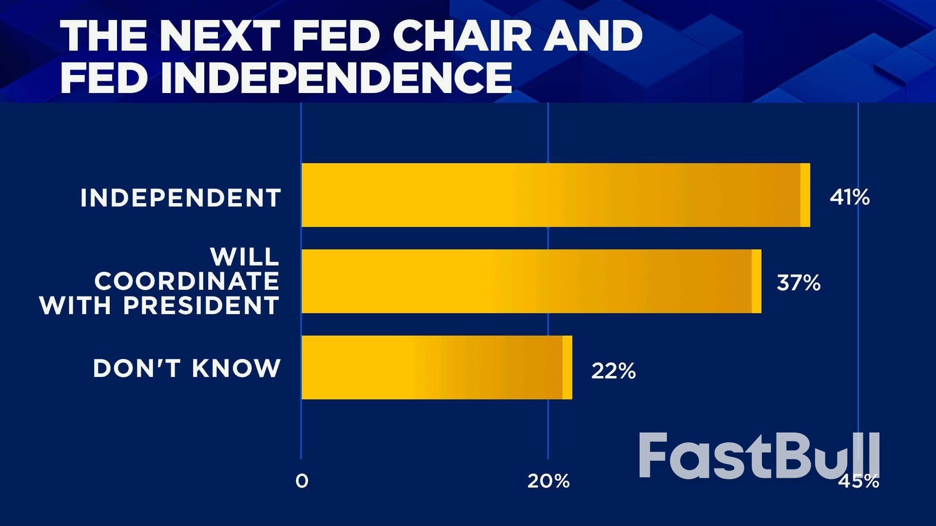調査では、回答者の41%が次期FRB議長は大統領から独立して金融政策を実施すると考えており、37%は協調して実施すると答えた。22%は不明と回答した。