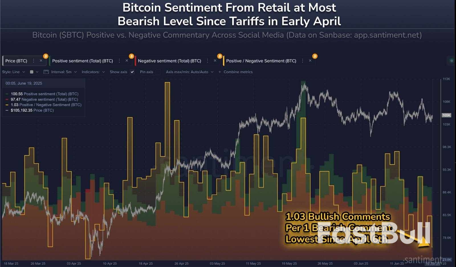 ビットコインに対する個人投資家のセンチメントは急激に悪化し、4月初旬以来の最も弱気な水準に達した。ソーシャルメディアにおける肯定的なコメントと否定的なコメントの比率は1.03に低下し、投資家の不満の高まりを反映している。歴史的に見て、このようなセンチメントの不均衡はボラティリティの上昇に先行する傾向がある。