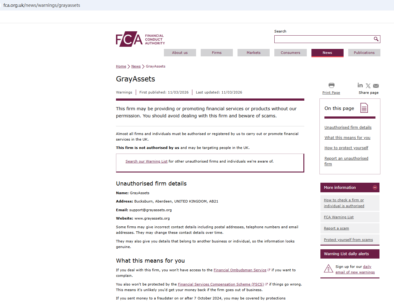 2026년 3월 11일, 영국 금융감독청(FCA)은 GrayAssets가 필요한 허가 없이 금융 서비스 또는 상품을 제공하고 있을 가능성이 있다는 이유로 경고를 발표했습니다. https://www.fca.org.uk/news/warnings/grayassets