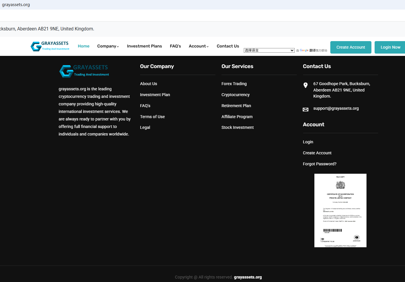이 회사는 영국에 사무실을 둔 신뢰할 수 있는 회사라고 주장하며 웹사이트 하단에 영국 회사등록소(CH) 인증서를 게시하고 있습니다. 하지만 CH는 단순히 사업자 등록을 의미할 뿐 외환 거래를 규제할 권한을 부여하는 것은 아니라는 점은 잘 알려져 있습니다. 더욱이 영국 금융감독청(FCA)은 GrayAssets가 필요한 허가 없이 금융 서비스 또는 상품을 제공하고 있을 가능성이 있다고 경고한 바 있습니다.