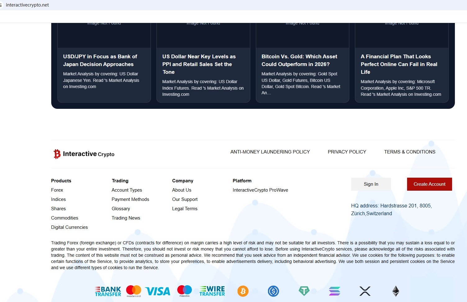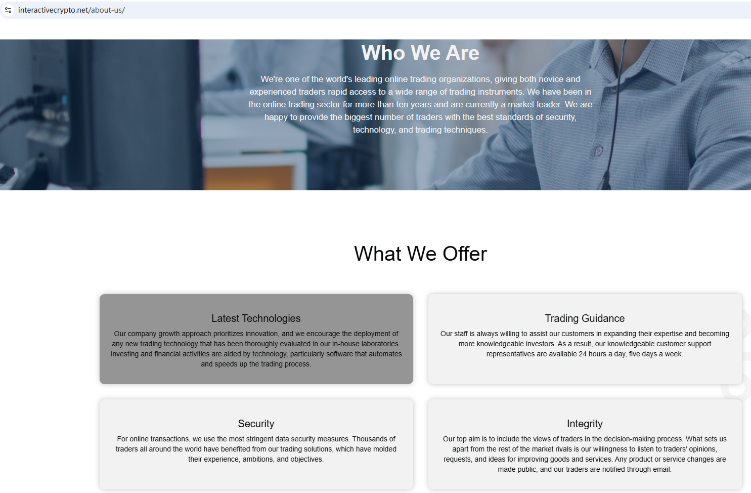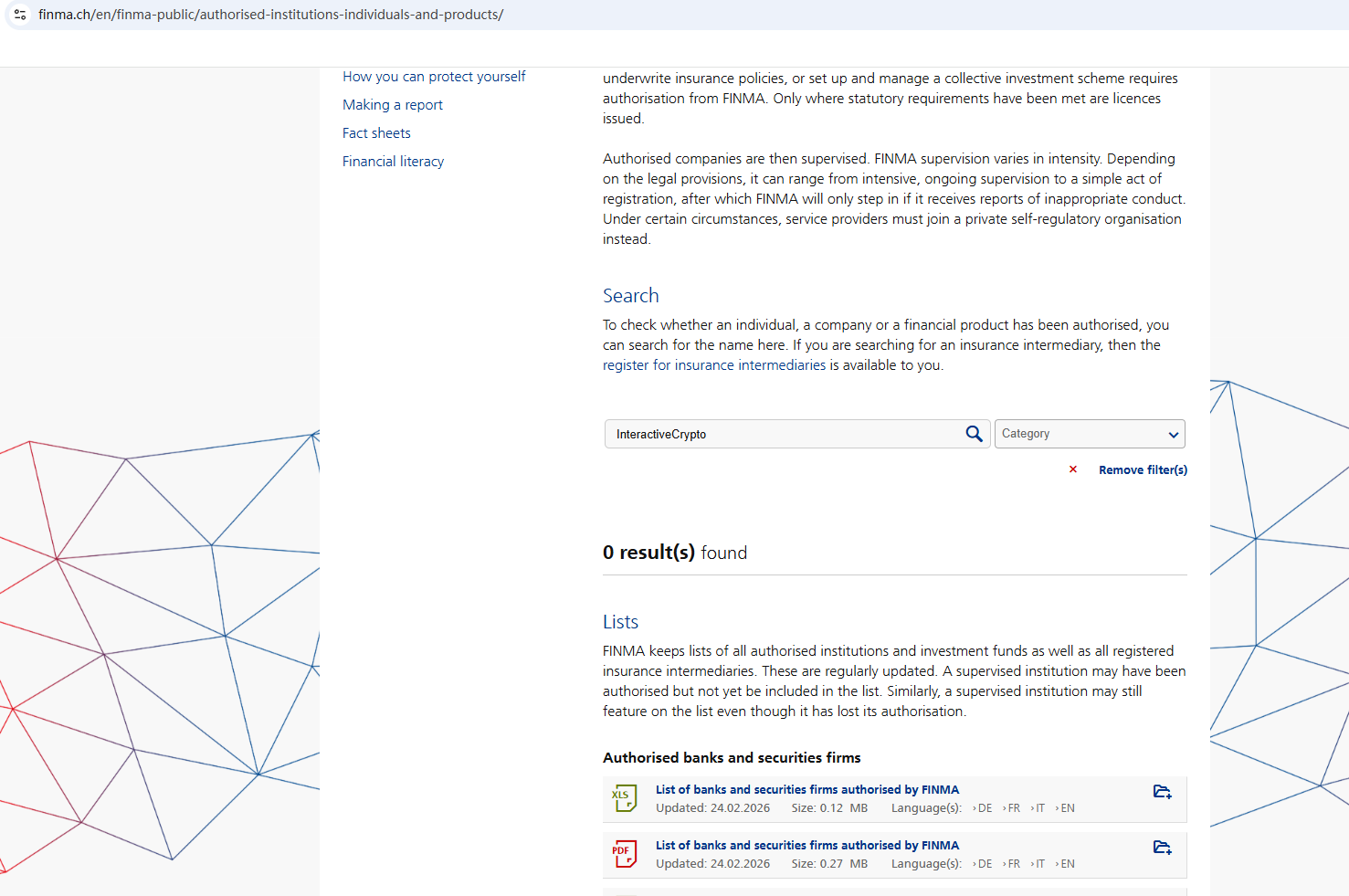 해당 웹사이트에 따르면 인터랙티브크립토는 사무실이 스위스에 있다고 주장합니다. 그러나 스위스 금융시장감독청( FINMA)에서 해당 정보를 검색한 결과 일치하는 내용을 찾을 수 없었습니다. 또한 영국 금융감독청(FCA)은 인터랙티브크립토가 필요한 허가 없이 금융 서비스 또는 상품을 제공하고 있을 가능성이 있다고 경고했습니다.
