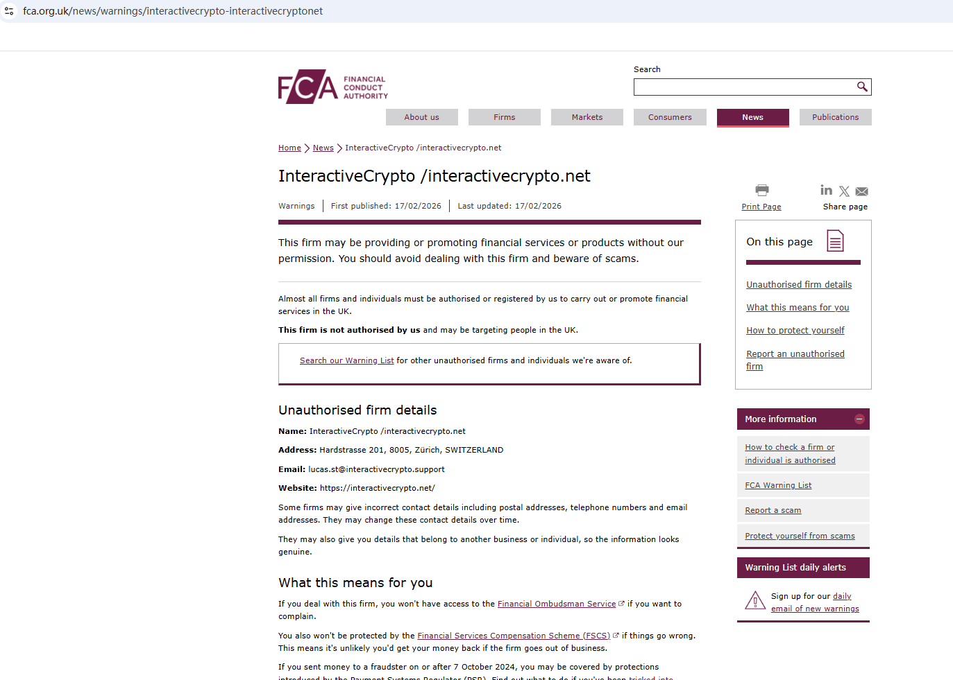 2026년 2월 17일, 영국 금융감독청(FCA)은 InteractiveCrypto가 필요한 허가 없이 금융 서비스 또는 상품을 제공하고 있을 가능성이 있다는 이유로 경고를 발표했습니다. https://www.fca.org.uk/news/warnings/interactivecrypto-interactivecryptonet