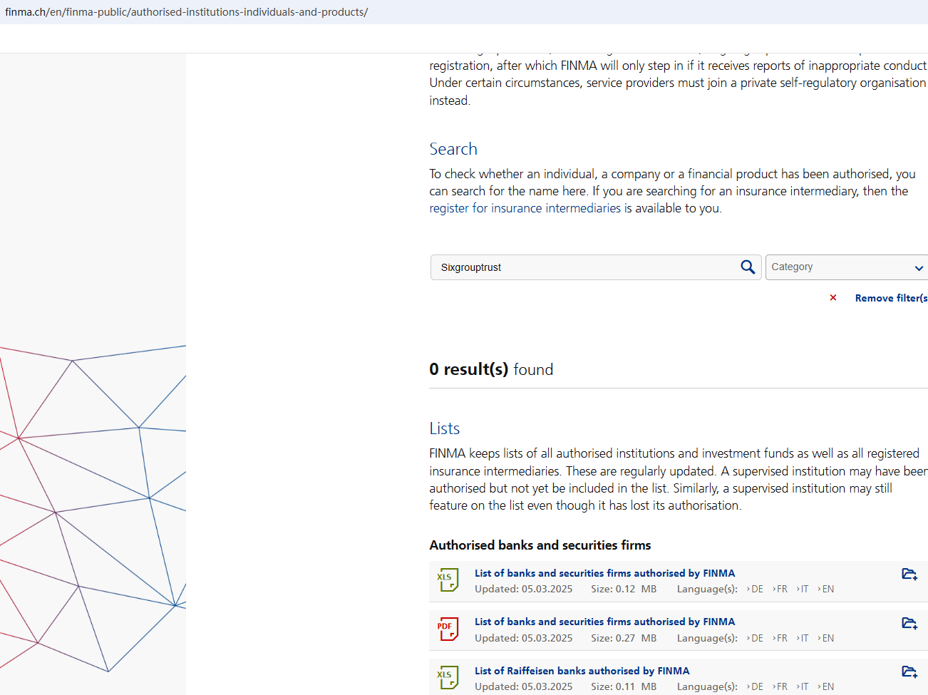 2025년 3월 12일, 스위스 금융시장감독청(FINMA)은 Sixgrouptrust라는 브로커가 상업등기부에 등록되어 있지 않다는 이유로 경고를 발표했습니다. https://www.finma.ch/en/finma-public/warnungen/warning-list/sixgrouptrust/
