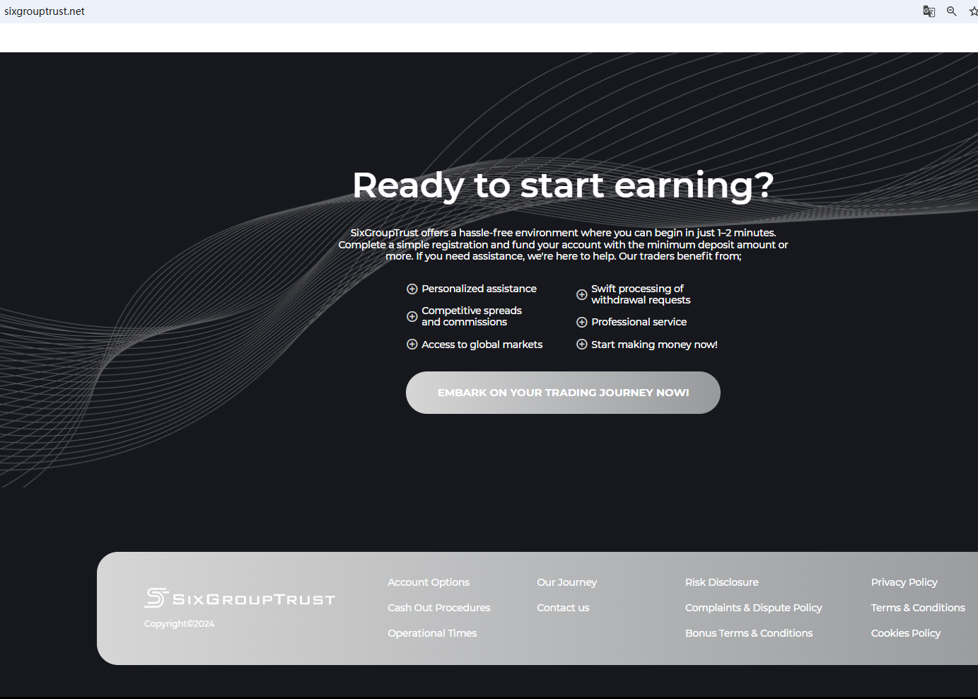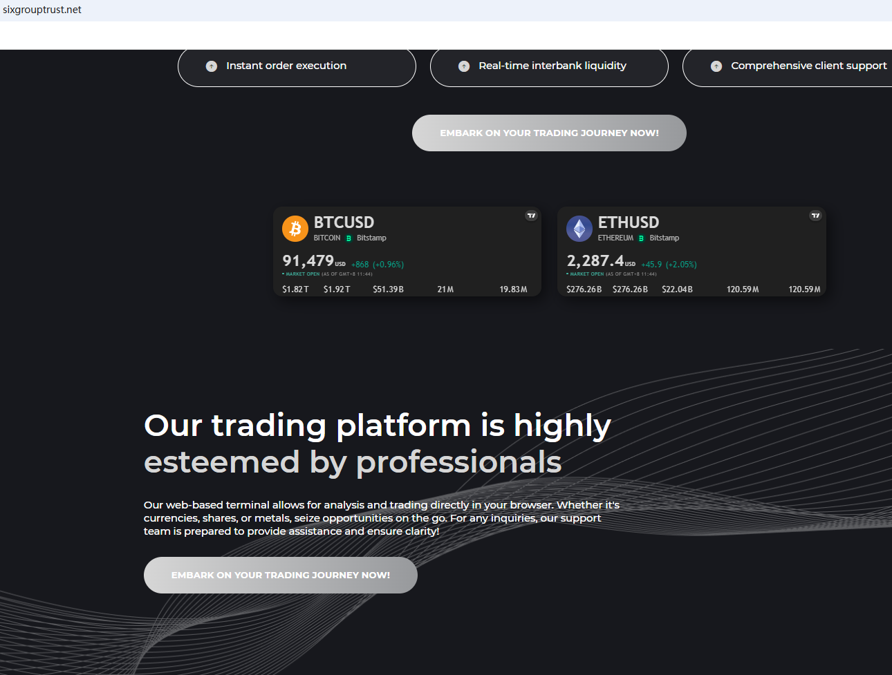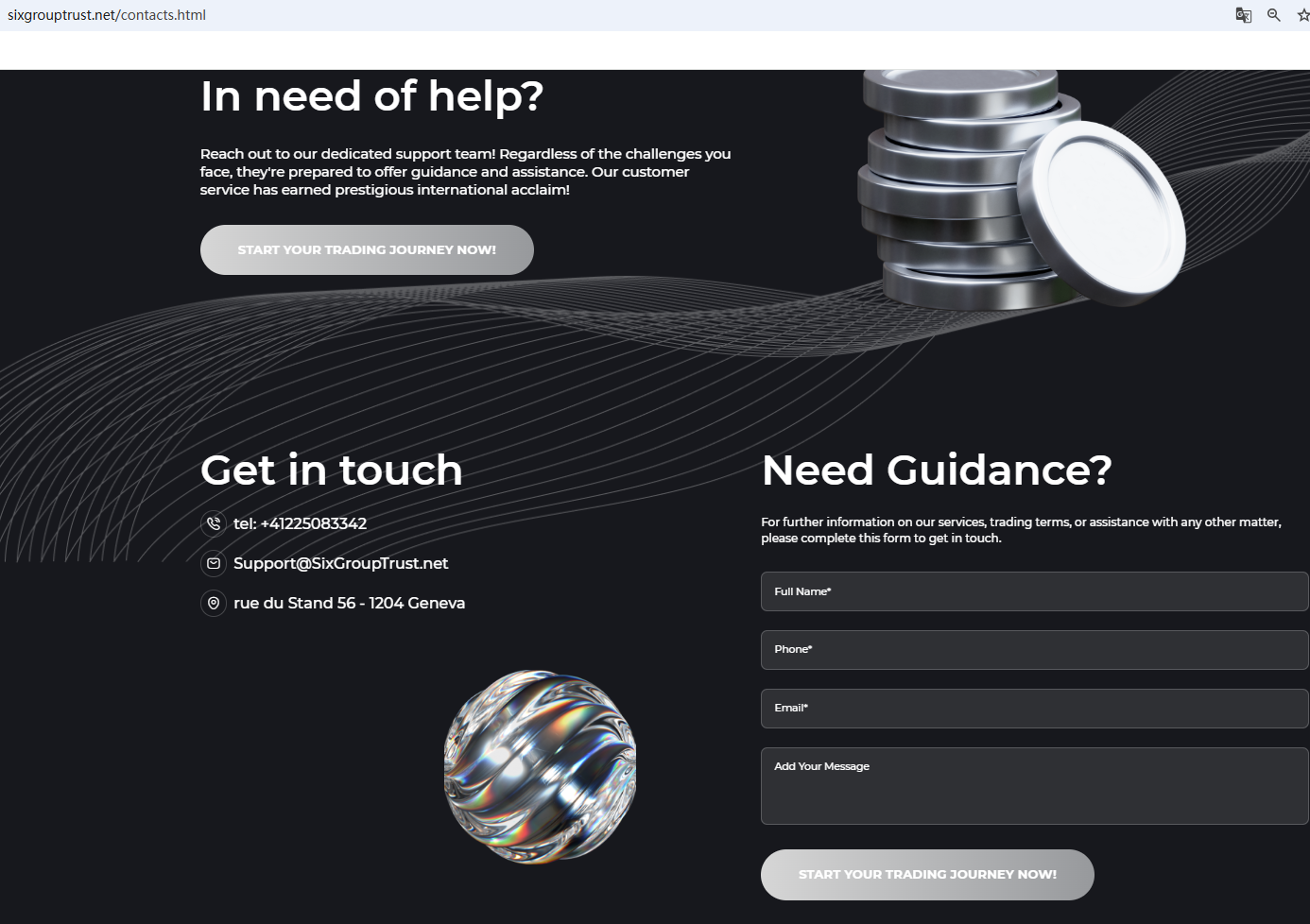 웹사이트에 따르면 이 회사는 제네바에 위치해 있습니다. 그러나 조사 결과 스위스 금융시장감독청(FINMA)에서 해당 정보와 일치하는 내용을 찾을 수 없었습니다. 또한 브리티시컬럼비아 증권위원회(BCSC)는 식스그룹트러스트(Sixgrouptrust)가 무허가로 금융 서비스 또는 상품을 제공하고 있다는 경고를 발표했습니다.