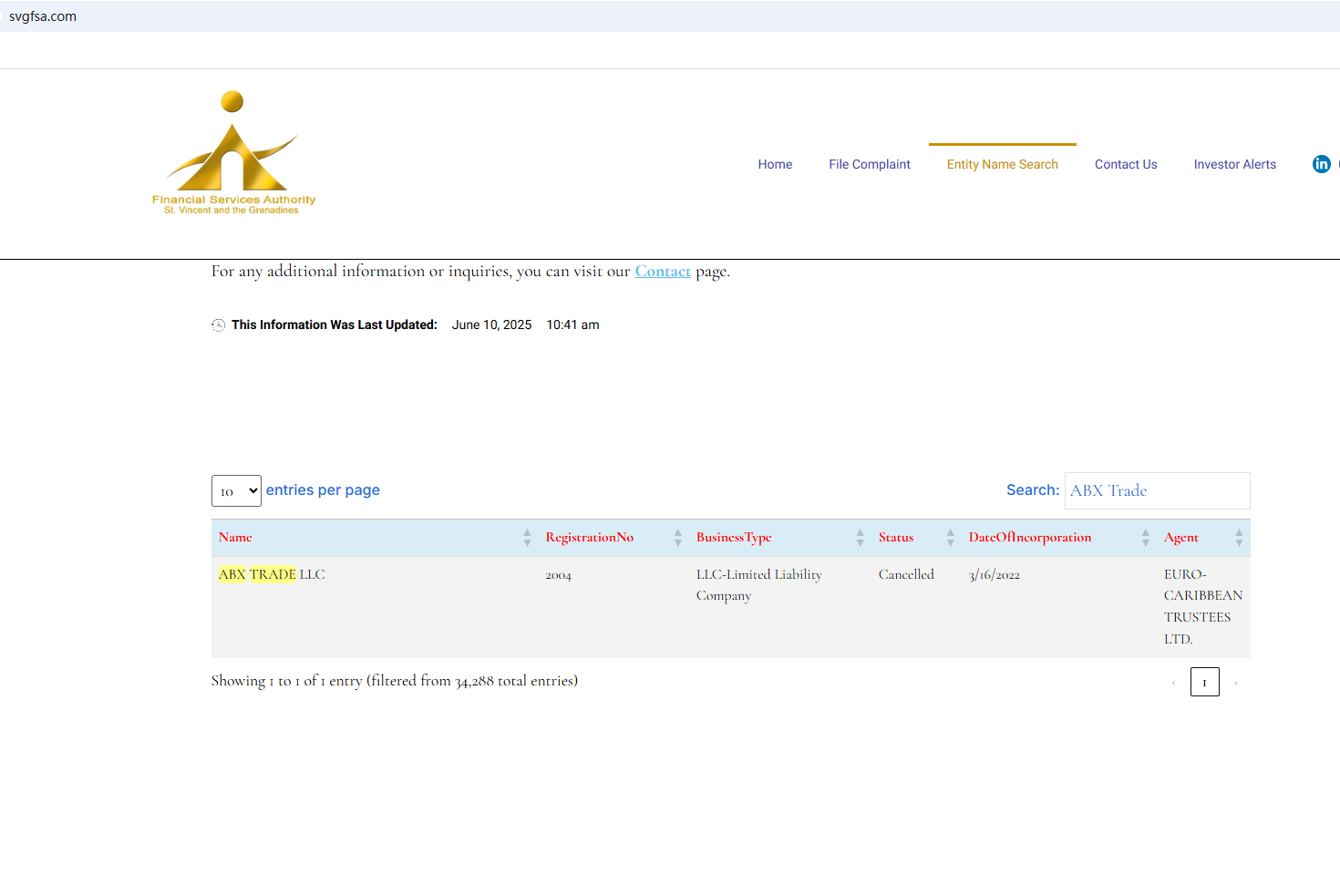 ABX Trade 도메인 이름이 판매됩니다. 세인트빈센트 그레나딘 금융감독청(SVG FSA)에 등록된 등록도 취소되었습니다. 모든 징후는 ABX Trade에 상당한 위험이 있음을 시사합니다. 투자자는 이러한 상황에 대해 숙지하고 신중히 접근해야 합니다.