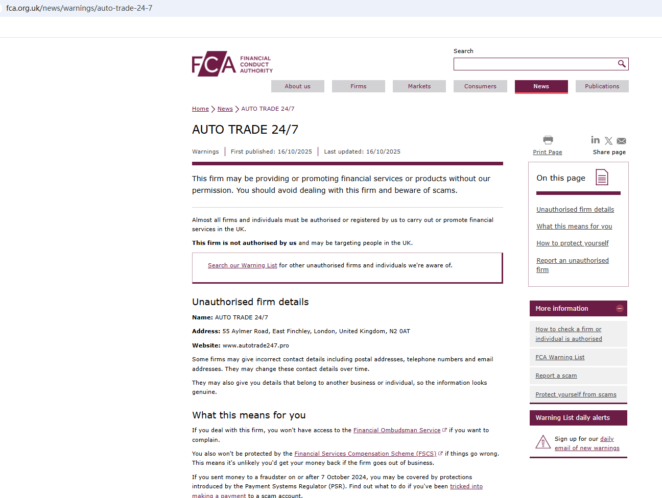 2025년 10월 16일, 금융행위감독청(FCA)은 AUTO TRADE 247에 대한 경고를 발표하며, 이 회사가 필요한 승인 없이 금융 서비스나 상품을 제공할 가능성이 있다고 의심했습니다. https://www.fca.org.uk/news/warnings/auto-trade-24-7