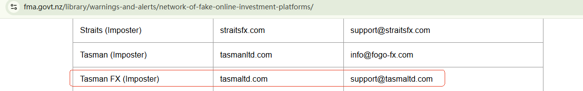 2025년 2월 17일, 뉴질랜드 금융시장청(NZ FMA)은 투자자들에게 tasmaltd.com을 포함한 96개의 의심스러운 투자 웹사이트에 대해 경계를 늦추지 말 것을 권고하는 경고 목록을 발표했습니다. https://www.fma.govt.nz/library/warnings-and-alerts/network-of-fake-online-investment-platforms/